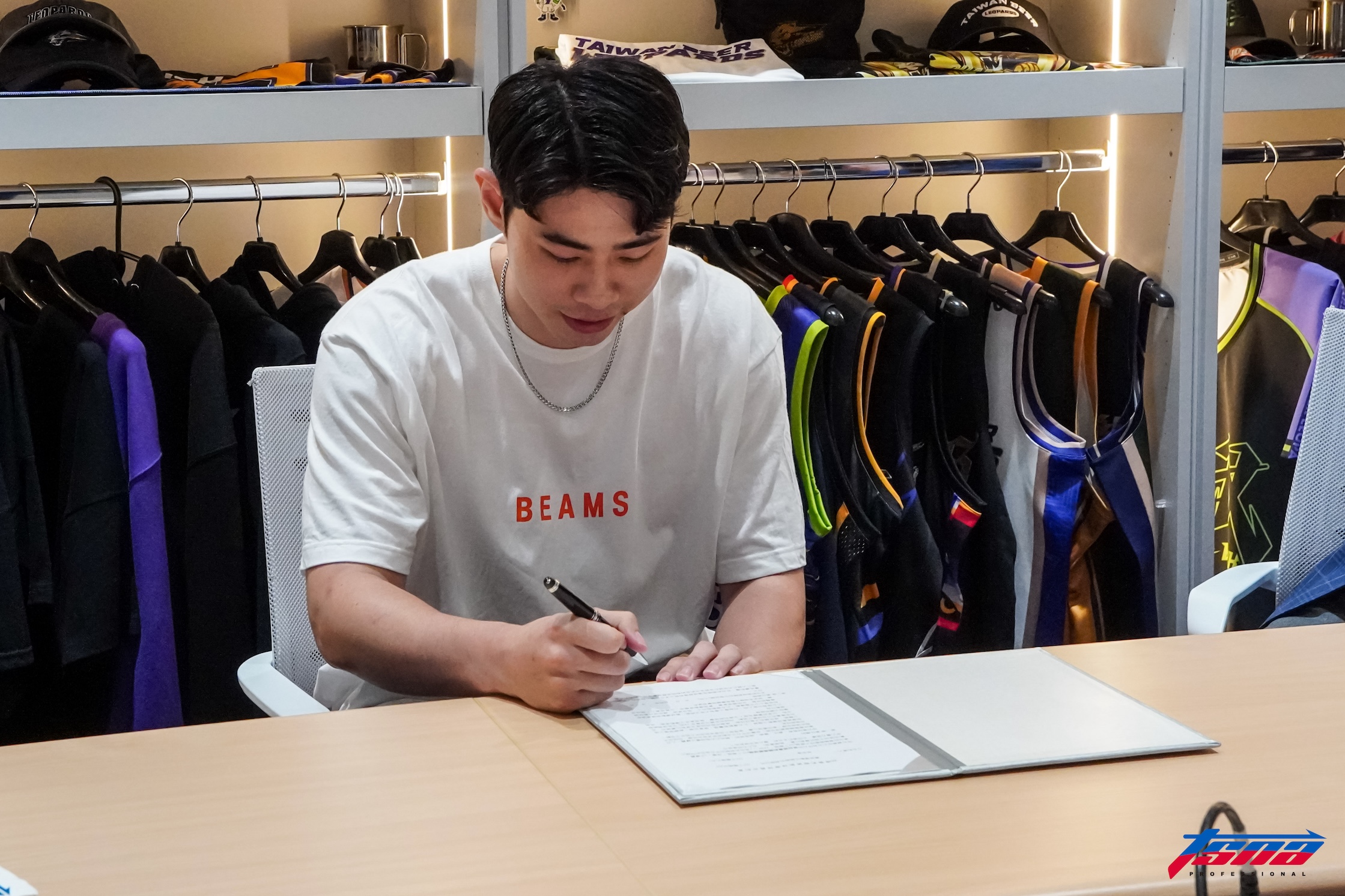 台啤永豐雲豹今天舉行「金牌特務」林信寬續約儀式。(黃以信攝)