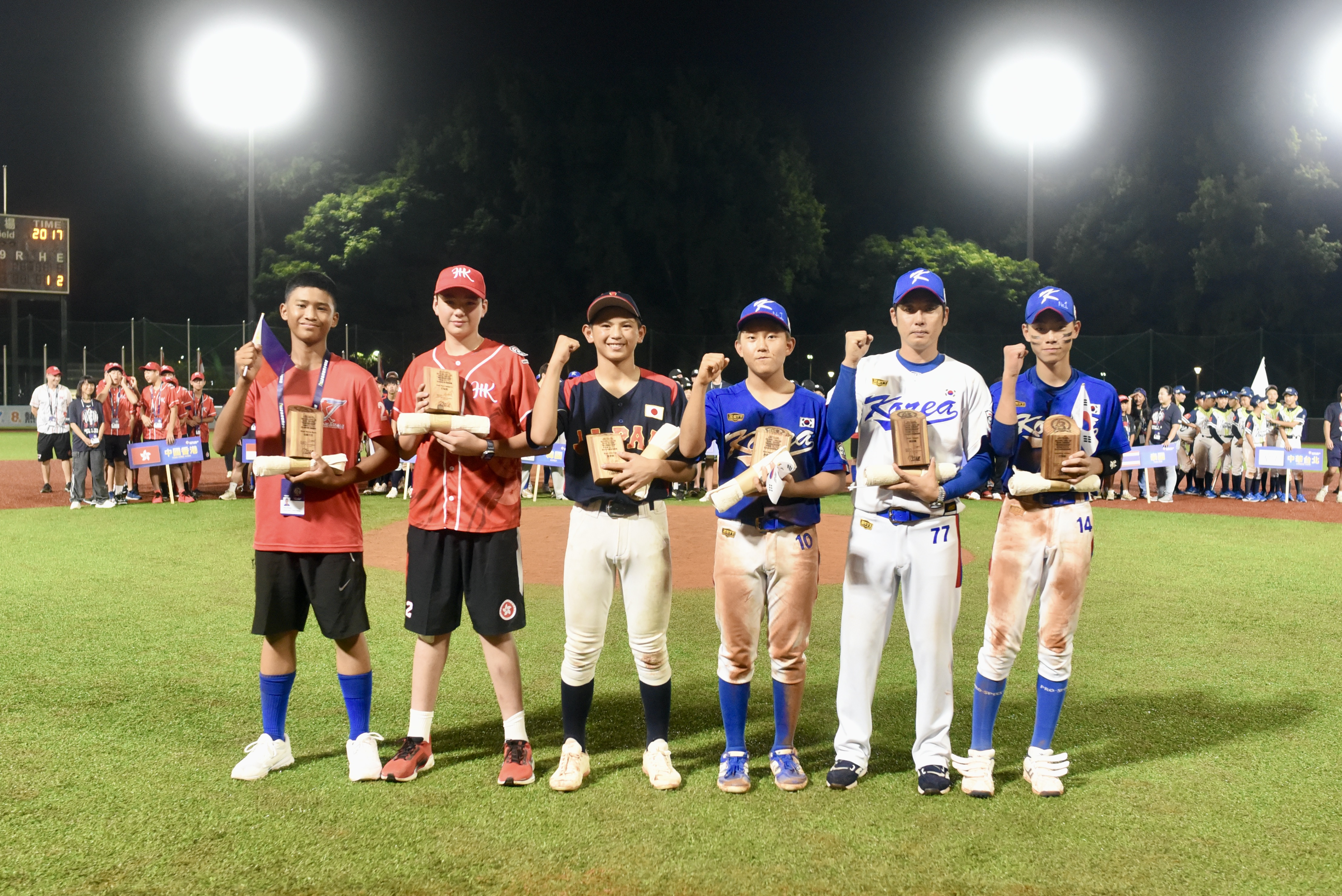 全壘打獎Delos Santos、打點獎Michael Clemmoms、石井大翔 、MVP全志原、教練獎鄭閩席、打擊獎李準瑞。(台灣世界少棒聯盟提供)