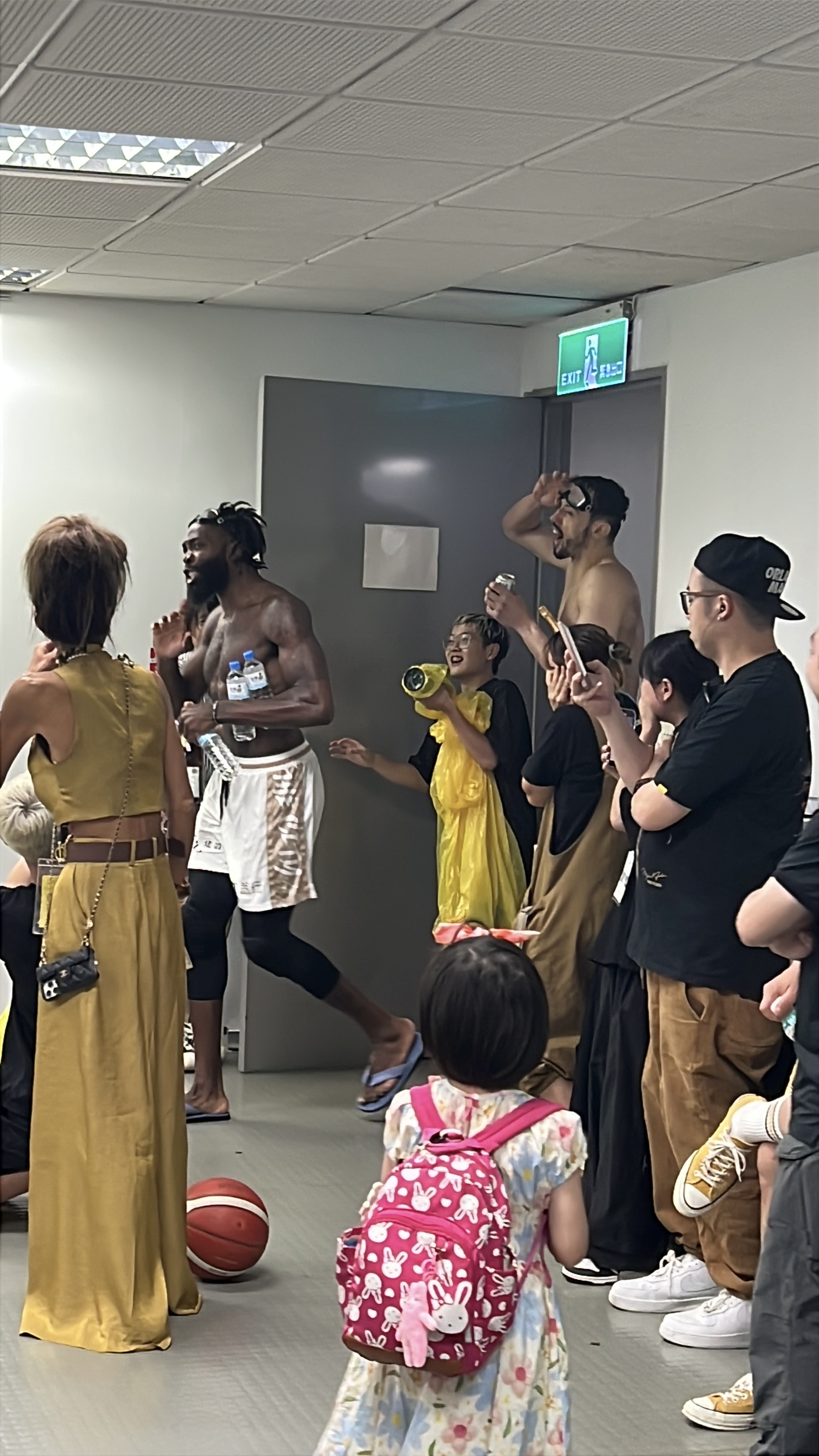 賽後記者會中有個插曲,沃許本、曼尼高先敲門,之後裸上半身,「強行」帶走林書豪等人去慶祝。(李宇政攝)
