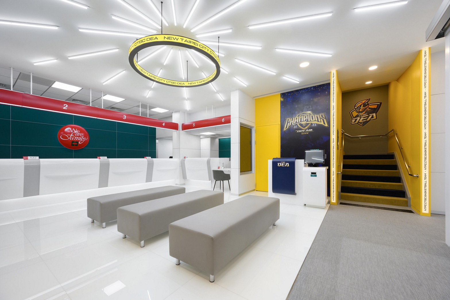全館以黃與藏青兩大隊色貫穿空間設計,顧客一走進分行就能感受運動與金融完美結合的創新氛圍,讓日常金融服務也能熱血沸騰。