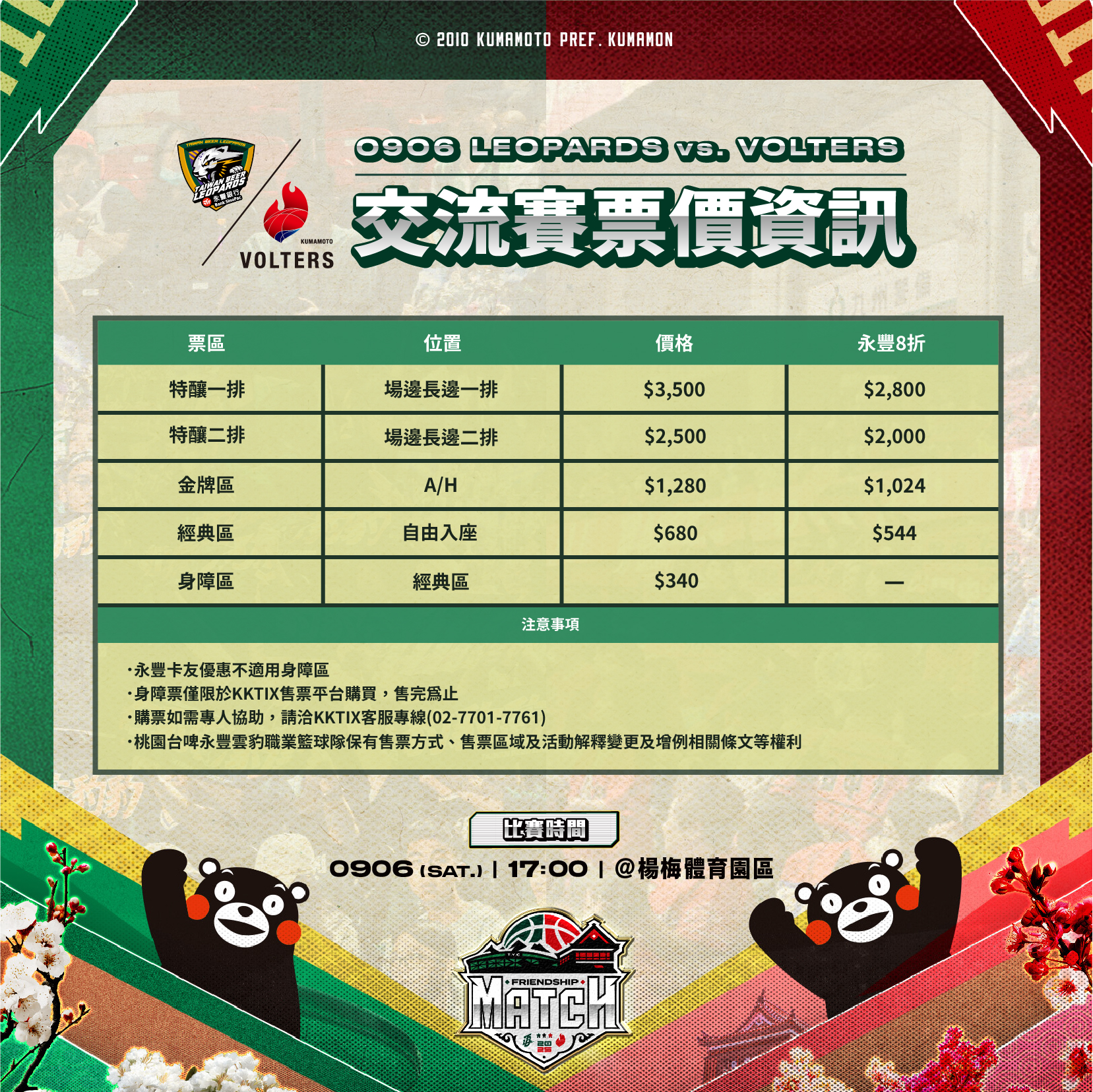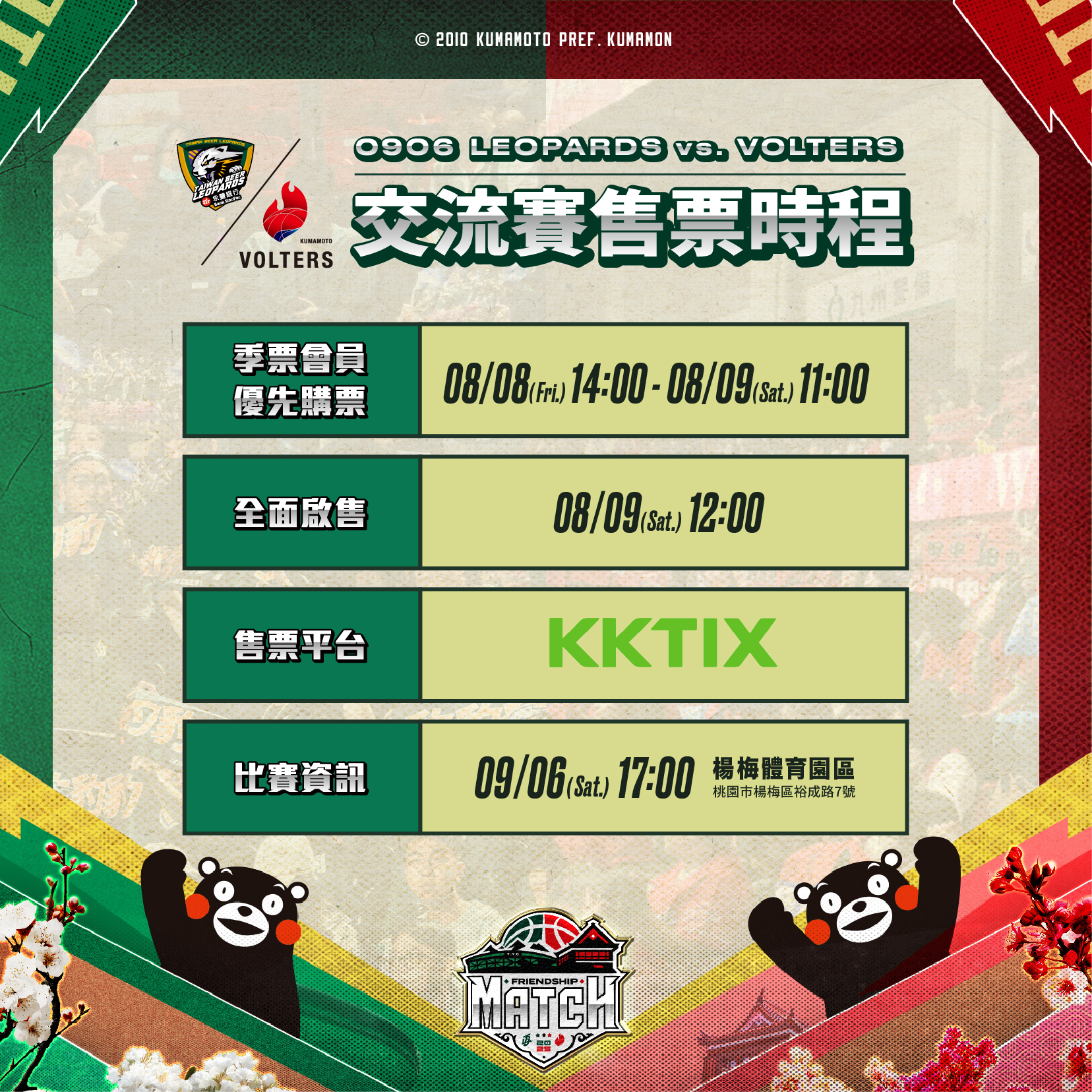 休賽季歷經中華隊洗禮的高錦瑋與林信寬,將帶領嶄新陣容迎戰擁有山本翔太、磯野寬晃等後場主力的熊本Volters,營運長顏行書說:「季前交流賽是球員磨練、磨合的黃金機會,更是新任總教練羅德爾(Henrik Rödl)首次的率隊亮相,期待球迷到場支持,一起見證這場充滿文化火花的籃球盛事!」,桃園在地品牌「MIDO翠菓子」力挺在地球隊,交流賽期間將提供雲豹款式的航空米菓,讓進場球迷們除了看呆萌可愛的「熊本熊」,還能將特製「豹哥」與「調啤豹」MIDO帶回家!