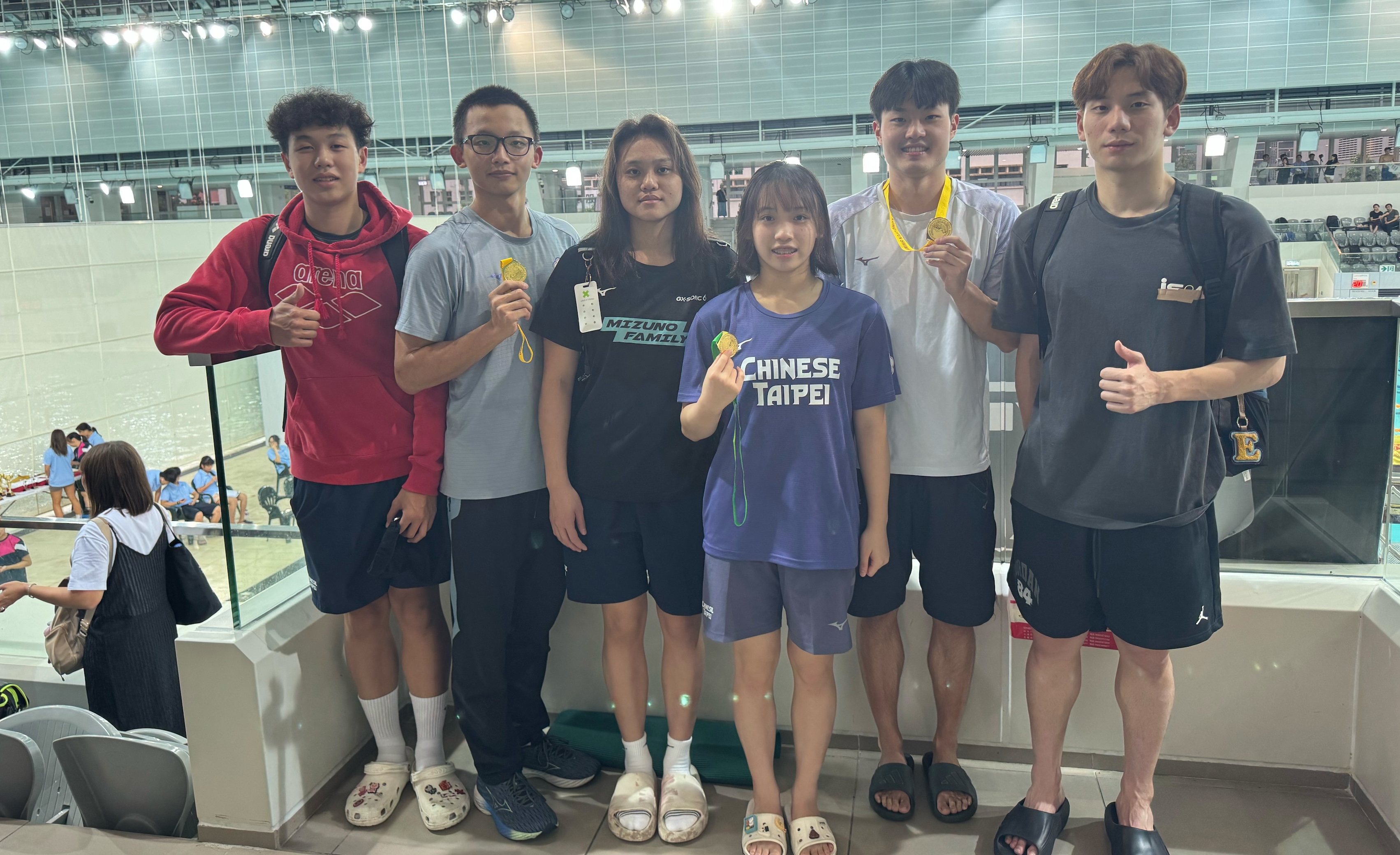 香港賽摘金的6名台將,吳亮昀(左起)、傅堃銘、李姵萱、林子芸、蕭永淇和王冠閎。(中華民國游泳協會提供)