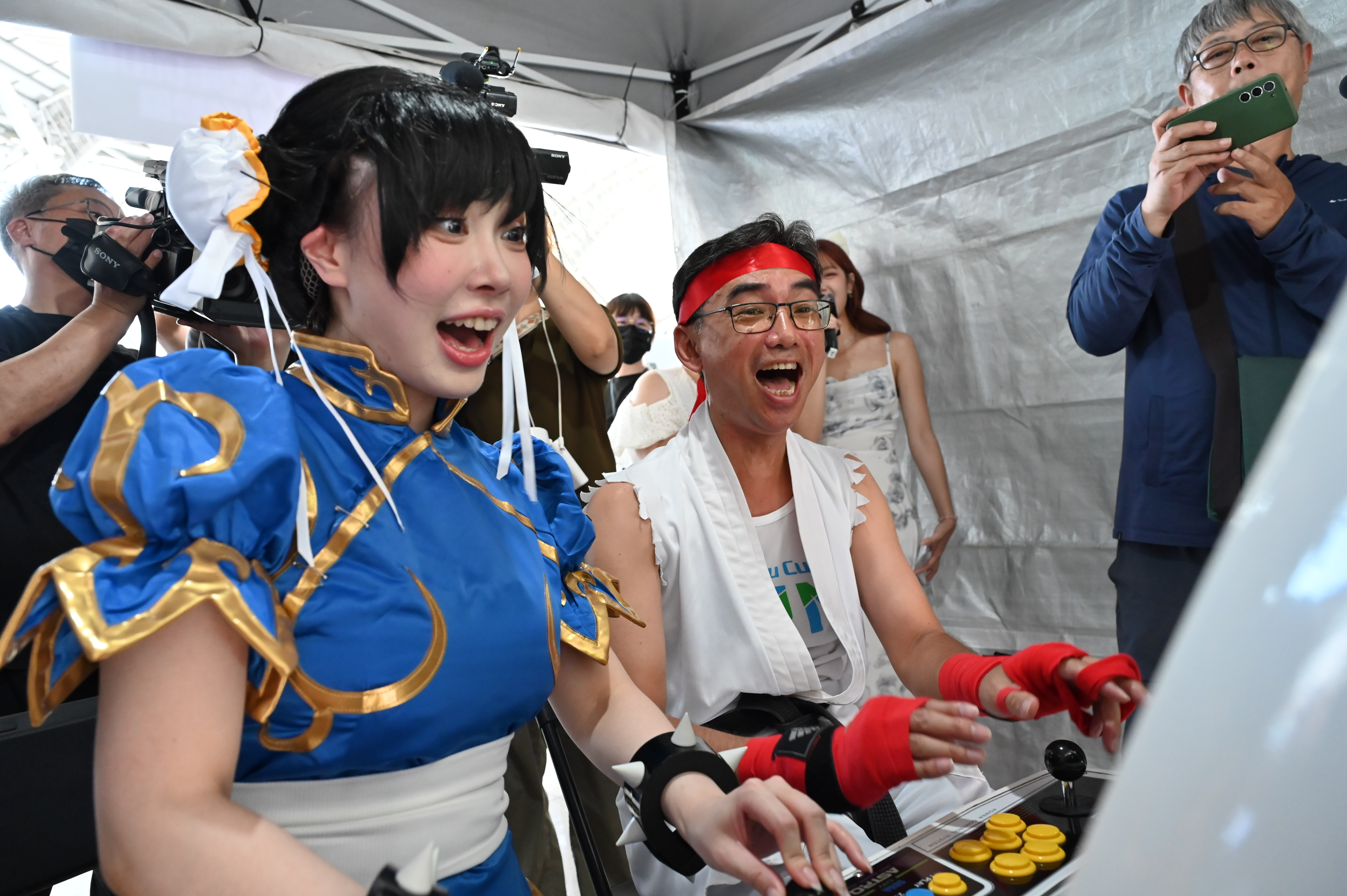 臺中市運動局局長游志祥cosplay隆,與cosplay春麗的活動大使苔苔以經典街機進行快打旋風對決。(臺中市運動局提供)