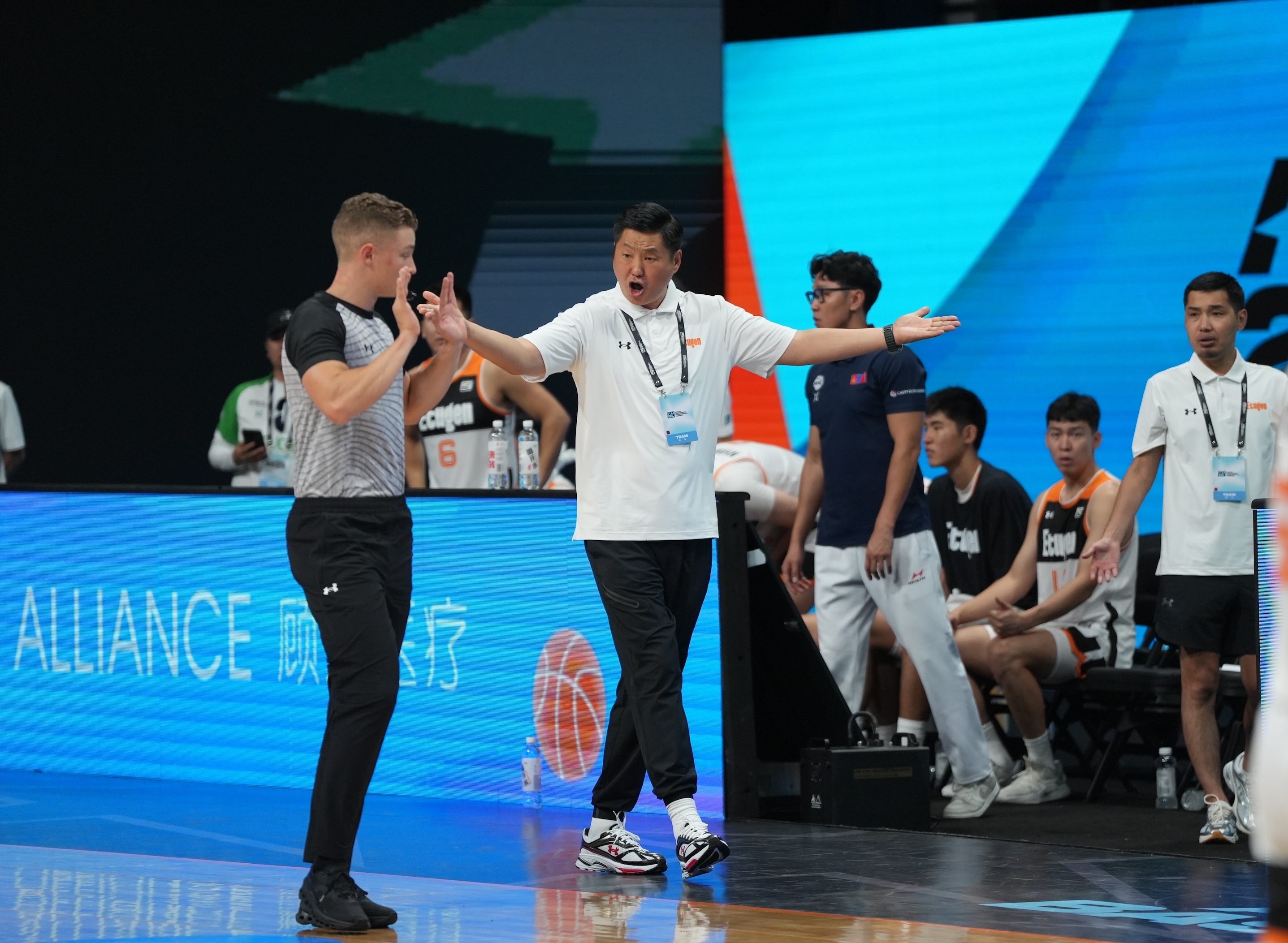 大會今天開始有賽後記者會,額圖根大學總教練Bayartsogt Odonbaatar在台上談話時,表情相當凝重。