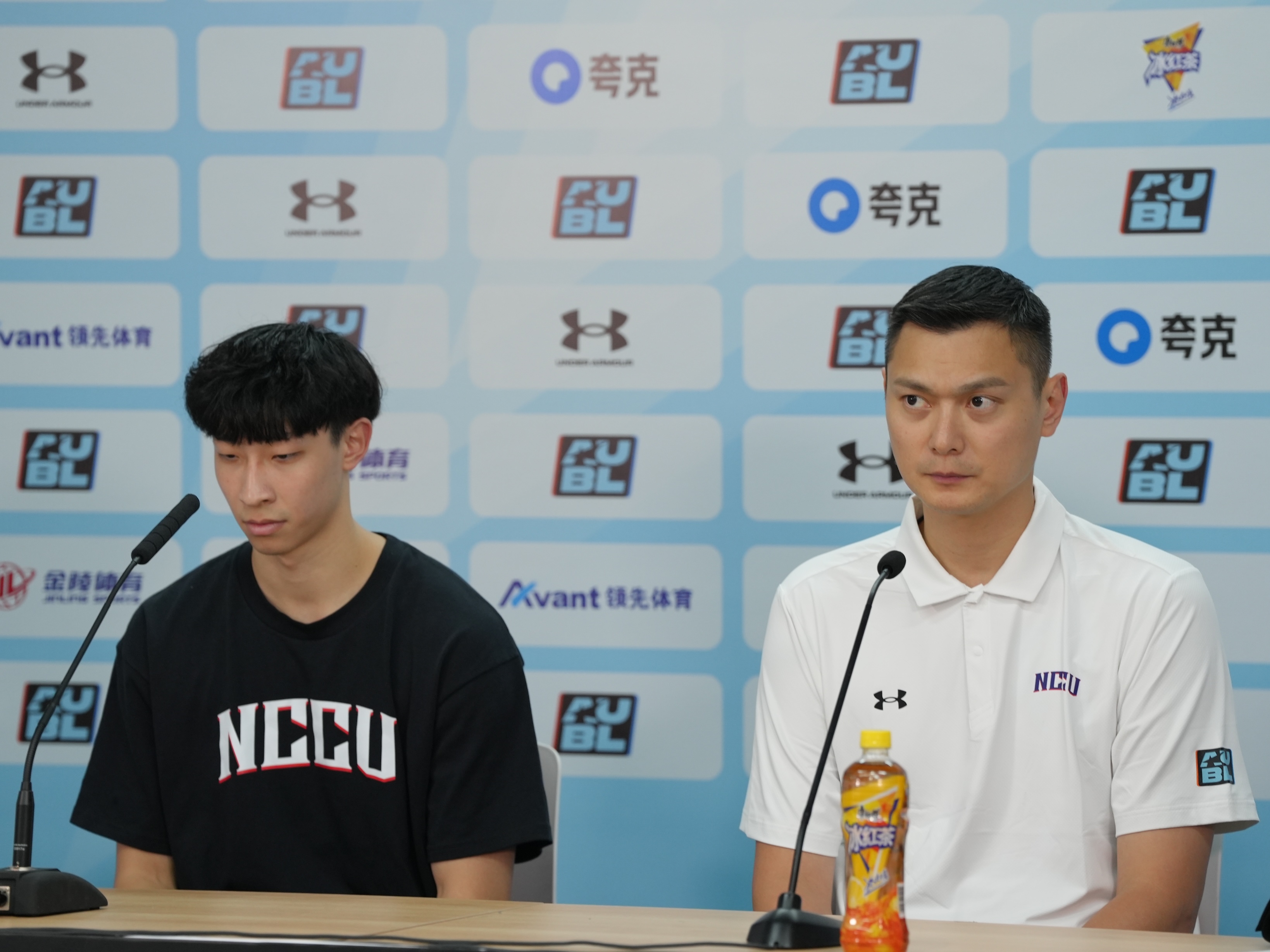 政大總教練陳子威、球員宋昕澔出席賽後記者會。(李宇政攝)