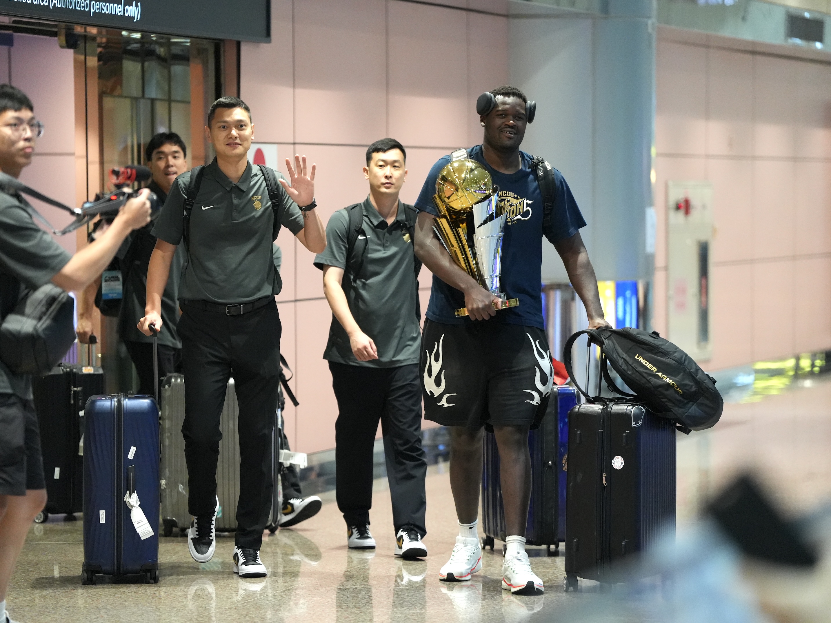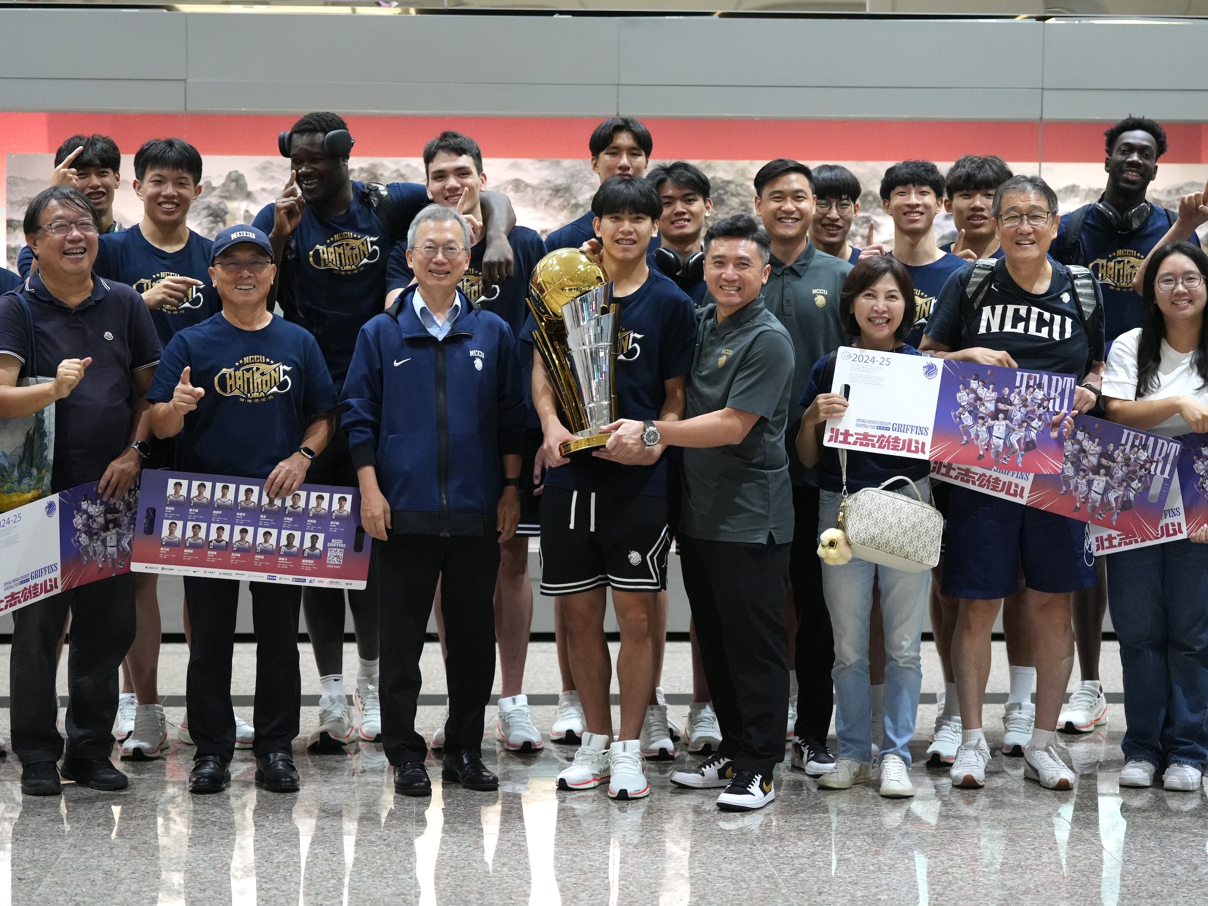 在杭州進行的首屆亞洲大學生籃球聯賽,政治大學(政大雄鷹)昨晚82比79力克北京清華大學後奪冠後,再拍完官方形象照已是深夜。今天清晨5時30分就在飯店集合前往蕭山機場,約中午抵達桃園機場,政大校長李蔡彥和師長也到機場接機,歡迎「鷹雄」凱歸。
