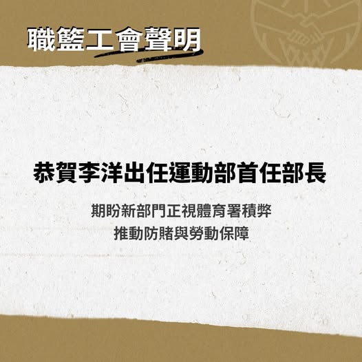職籃工會首先要共同恭賀 李洋 正式出任運動部首任部長。