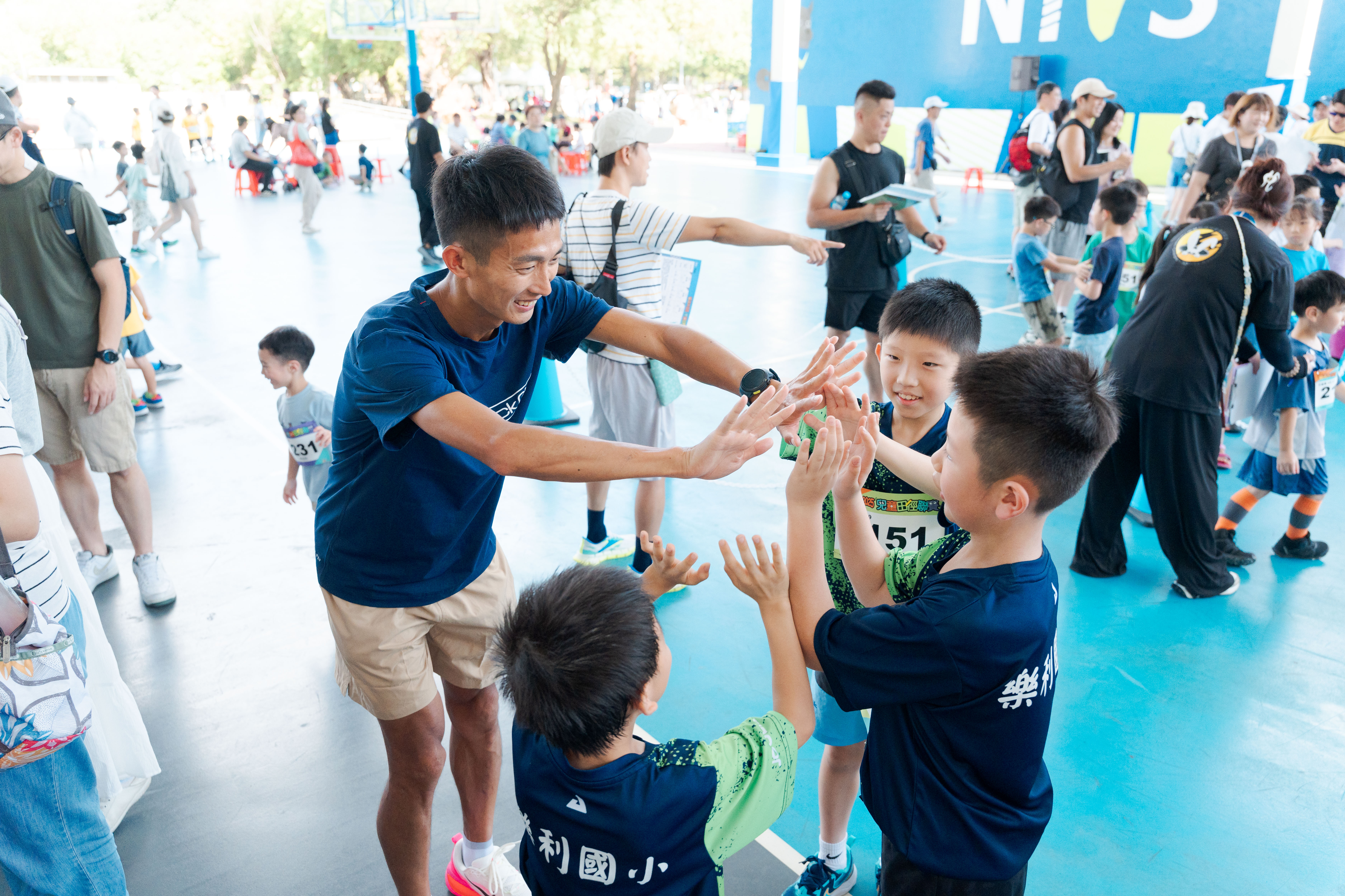 新北市田徑金牌長跑好手周庭印,今日也在現場為小朋友加油打氣,去年升格當爸爸的他,鼓勵孩童走出戶外,盼望藉由寓教於樂,讓小朋友感受田徑運動的魅力。周庭印表示「看到這麼多小朋友這麼有活力的準備比賽,感到很開心,田徑運動不只是速度與力量的追求,更重要的是小朋友們的毅力和團隊合作,比賽一定有輸有贏,希望小朋友可以抱持著開心、挑戰的心態去完成比賽。」