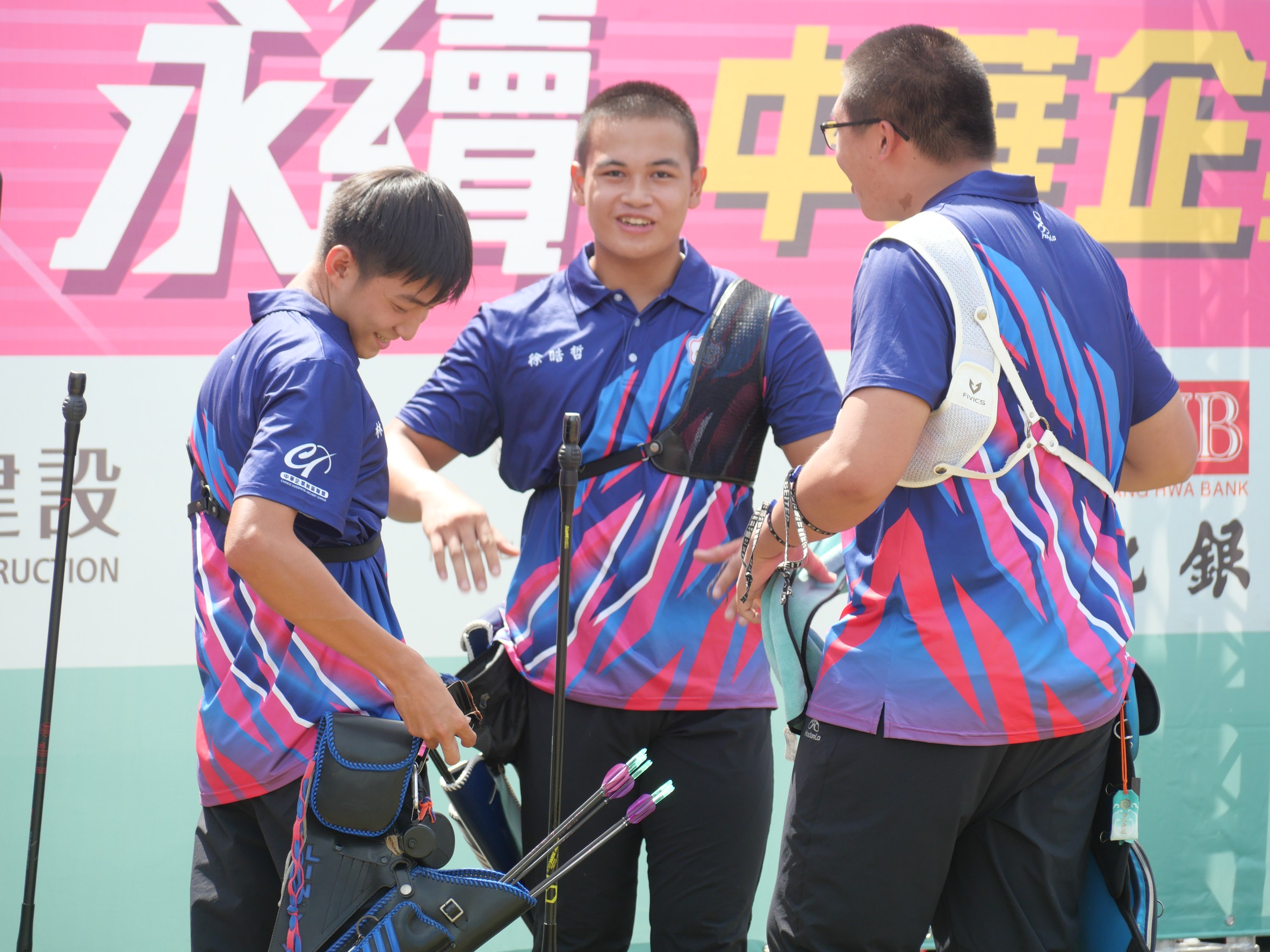(左起)林育暘、徐晧哲、潘威誌在今日男團戰第4局射出協會青年各隊史上首次60分完美一局。(中華民國射箭協會提供)