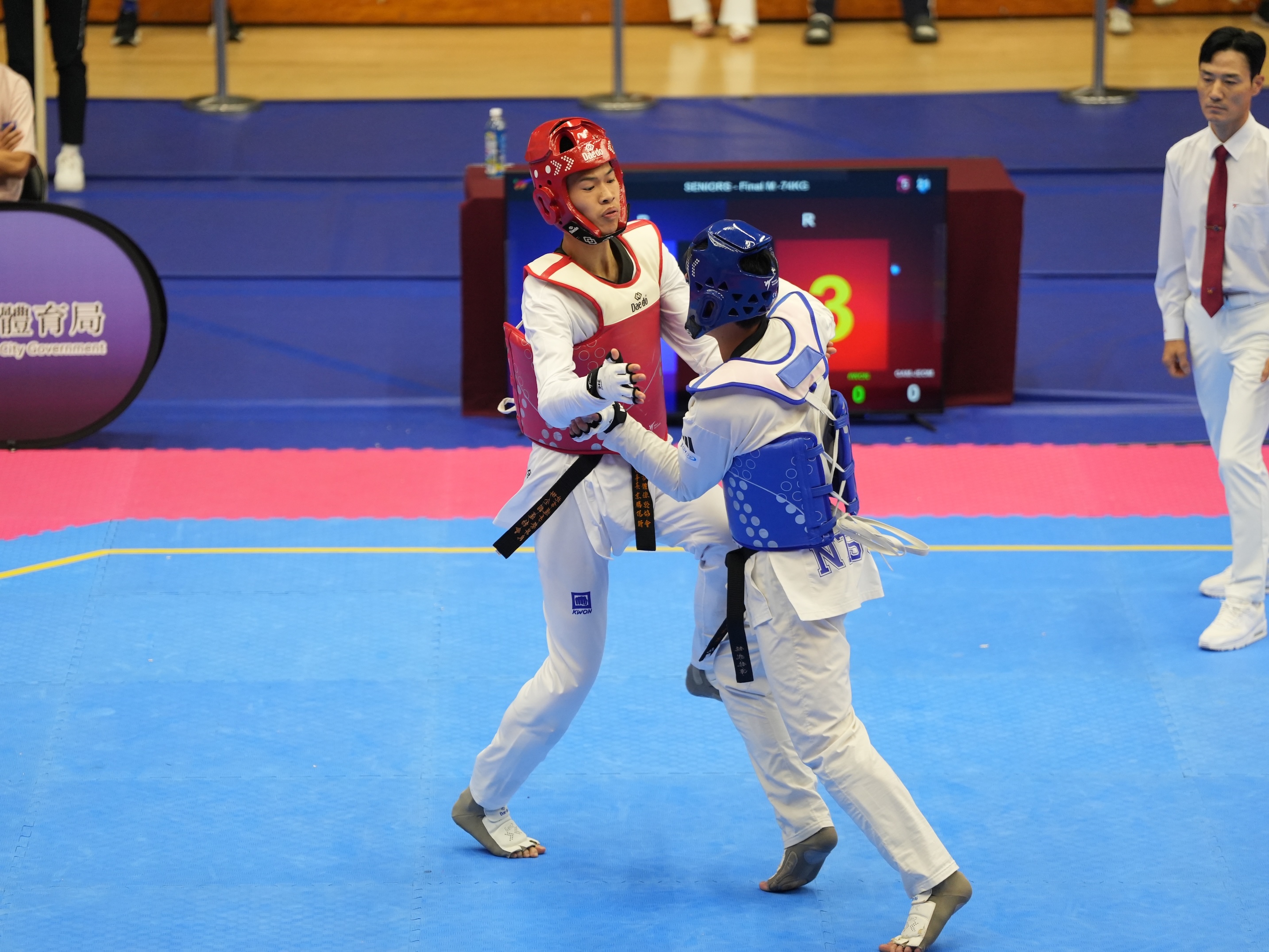 賽事代言人蔡昇良(紅色護具)和陳家昇(青色護具)在冠軍賽對決。(李宇政攝)