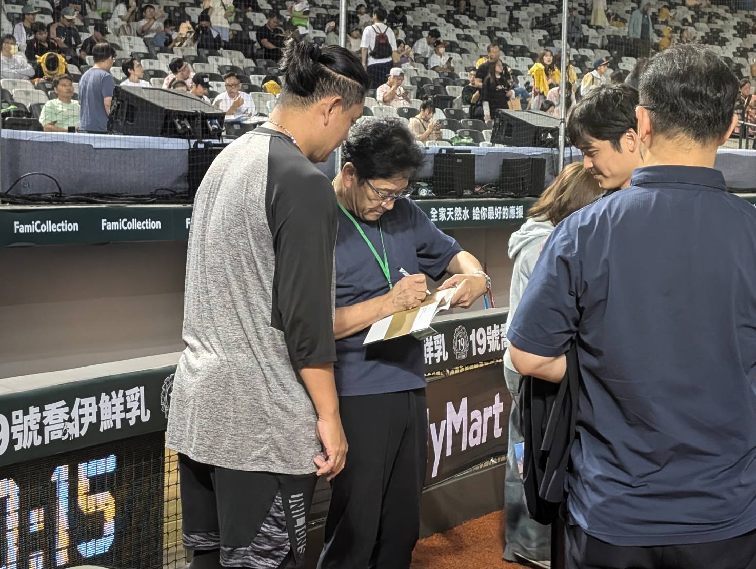 日本火腿鬥士隊首席棒球總管栗山英樹今(28 日)現身台北大巨蛋,觀戰台鋼雄鷹對統一獅之戰。賽前他也與兩隊教練團和行政團隊互動,統一獅傳奇投手「嘟嘟」潘威倫更拿出栗山的著作,請他簽名留念。