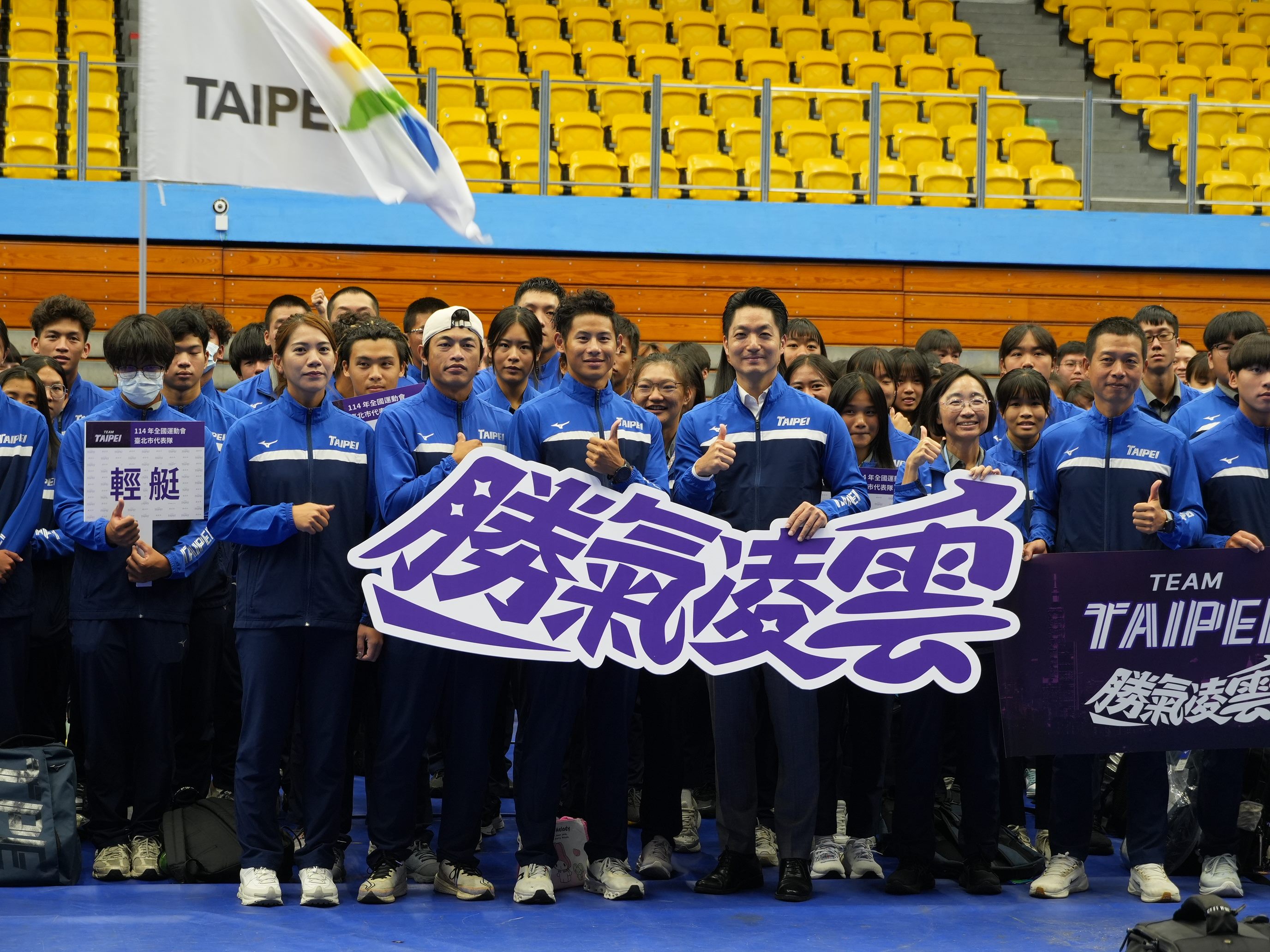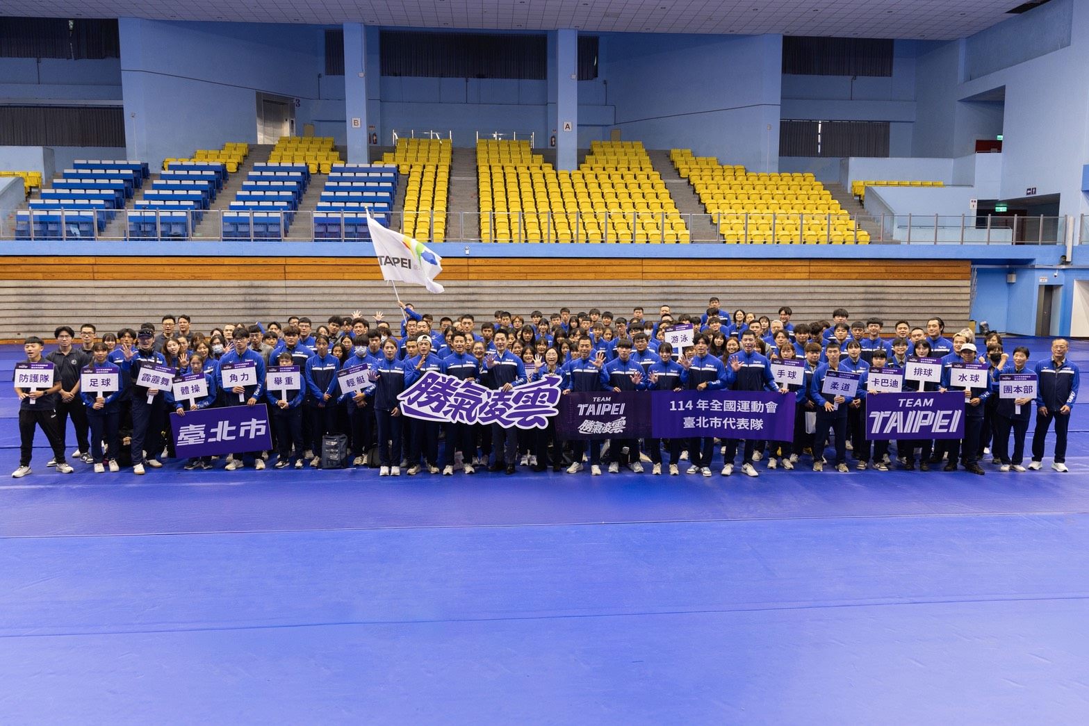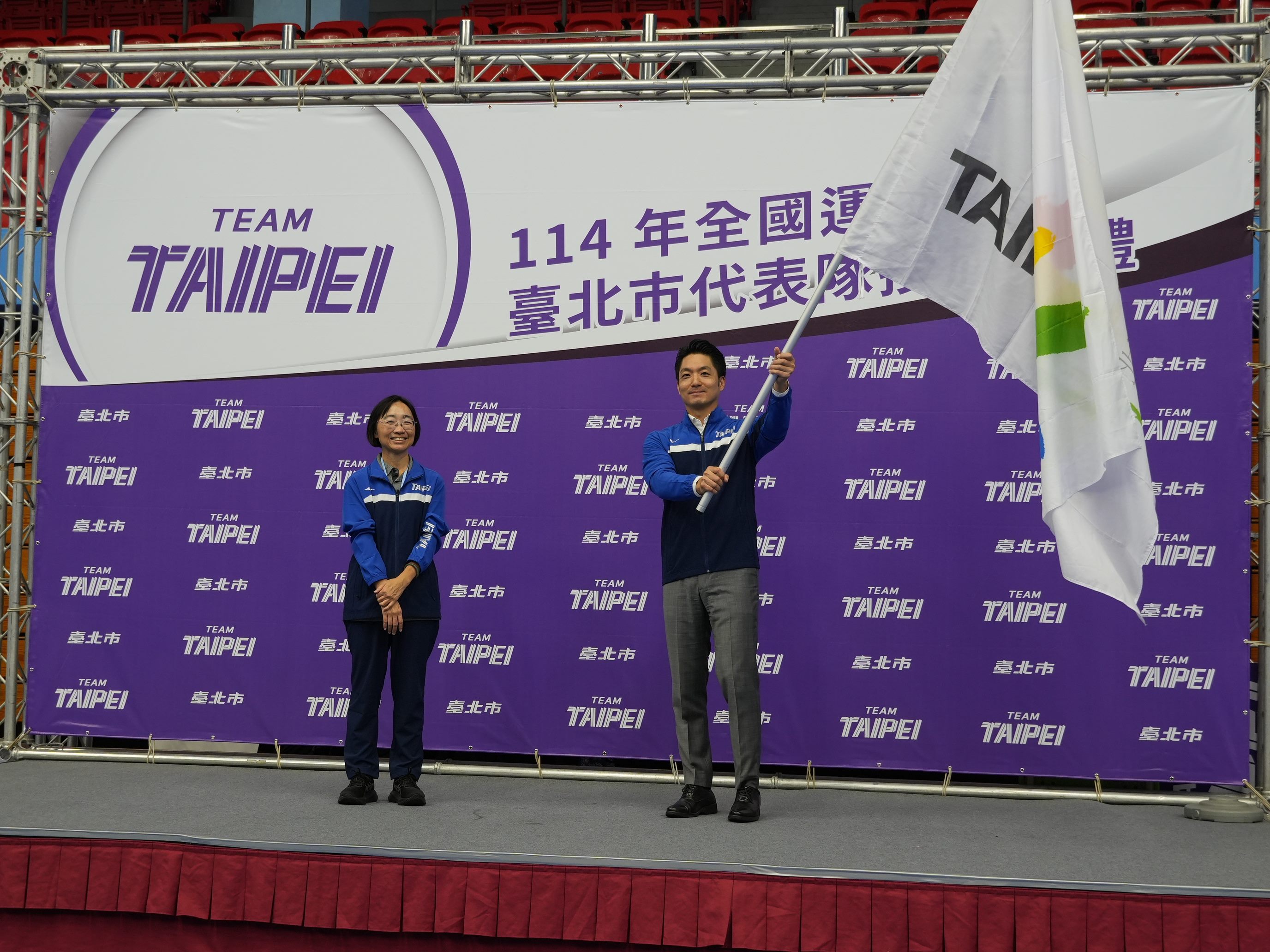 蔣萬安在授旗典禮中勉勵全體選手:「台北市代表隊承載著市民的期待與榮耀,每位選手的努力與拚搏,都是台北精神最真實的展現。希望大家能以團隊為後盾、以榮耀為目標,在賽場上全力以赴,不僅突破自我,也再次把最高榮耀帶回台北。」