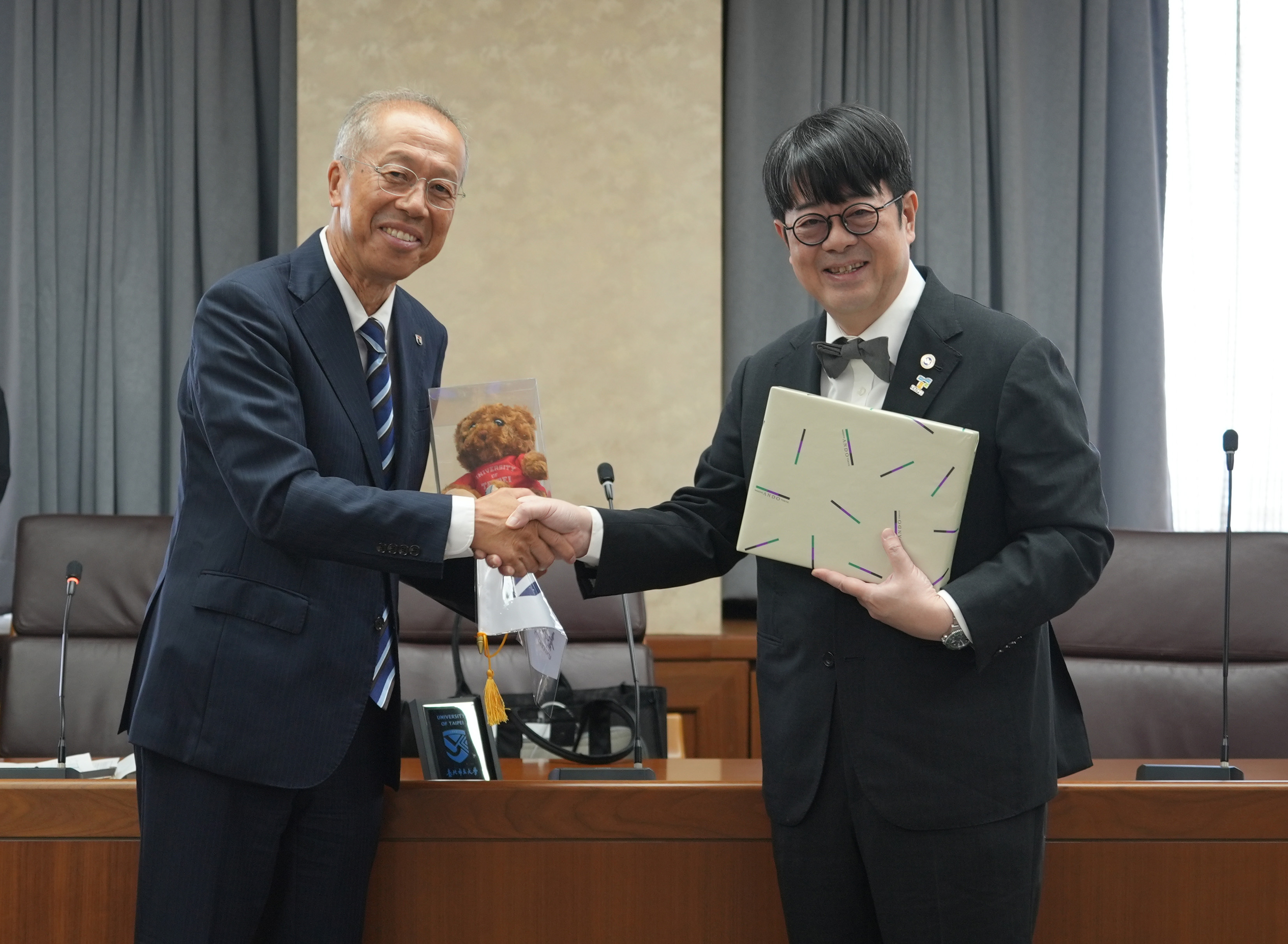 校長淺井清文也歡迎來自台灣的姊妹校北市大來訪,他說:「我們以最誠摯的心情,來歡迎北市大參訪,之前因為是在網路上以視訊線上簽約,這次可以會面進一步討論,對雙方來說,都是很棒的經驗。」
