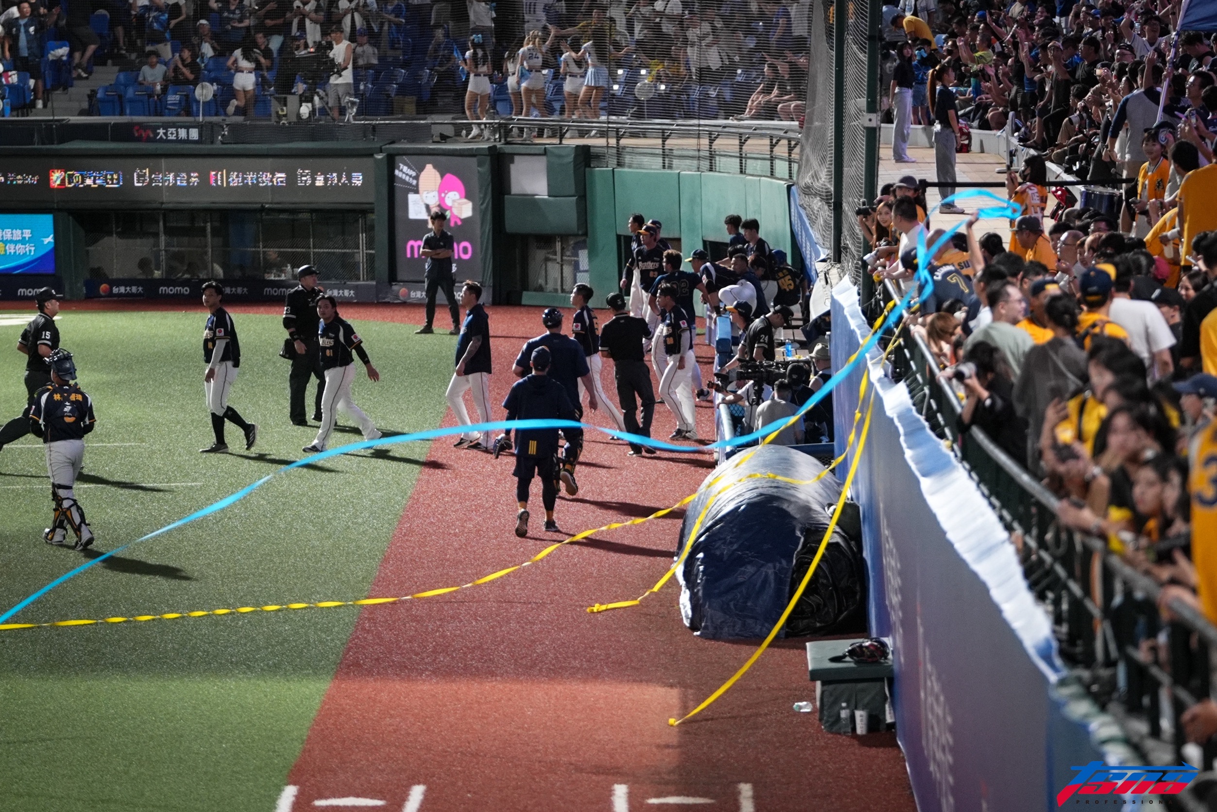 中信兄弟今天保留比賽作客富邦悍將,這場關鍵「封王戰」湧進滿場11600位球迷,是本季第三次滿場。兄弟雖在2局上先打下3分,不過富邦悍將展現韌性,在8局下靠董子恩關鍵安打追平戰局,兩隊進入延長加賽,兄弟先是攻下2分,不過悍將在10局下靠魏全擊出追平安打,蔡佳諺選到再見保送,終場富邦悍將就以6:5氣走中信兄弟,不讓黃色彩帶在新莊拋下,有趣的是,外野有悍將球迷丟下藍色彩帶,成為有趣一幕。