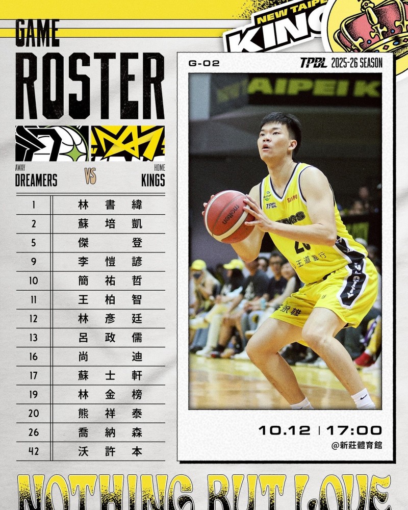 國王昨在開幕戰7人得分上雙,以110:100擊退高雄全家海神,洋將傑登攻下全隊最高22分,新人林彥廷、熊祥泰也有亮眼表現。國王今主動變陣,將昨天登錄的桑尼替換為去年年度最佳洋將沃許本,與傑登、尚迪組成完整洋將戰線,目標鎖定二連勝。
