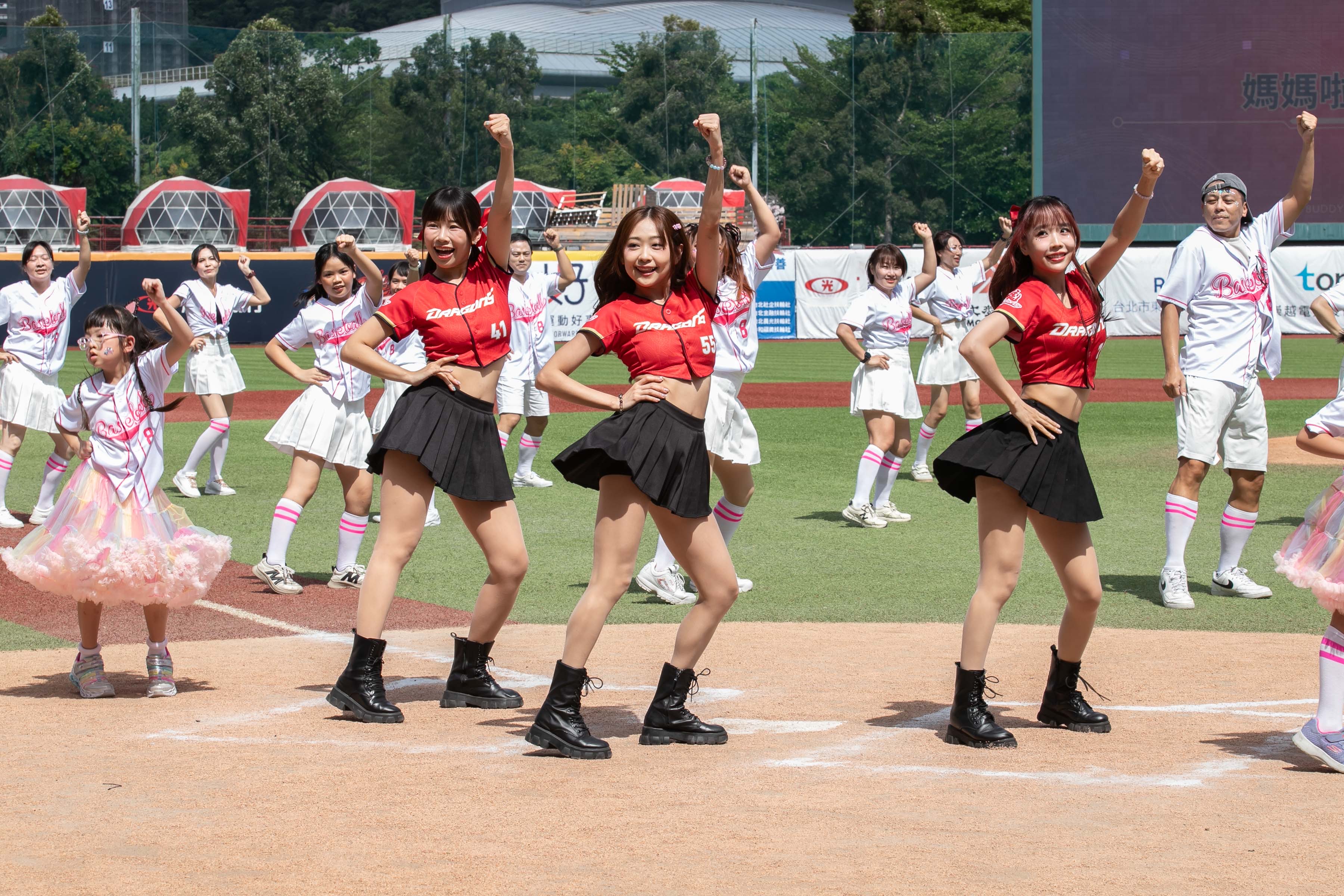 開幕表演由媽媽啦啦隊與小龍女成員寧寧、小蛙、蘿拉一起跳開場舞,雖然練習時間短,但媽媽們把握每次練習的機會,努力練習,在場上跳舞除了傳達「想為孩子加油」的心意外,也可以紓解身心壓力。