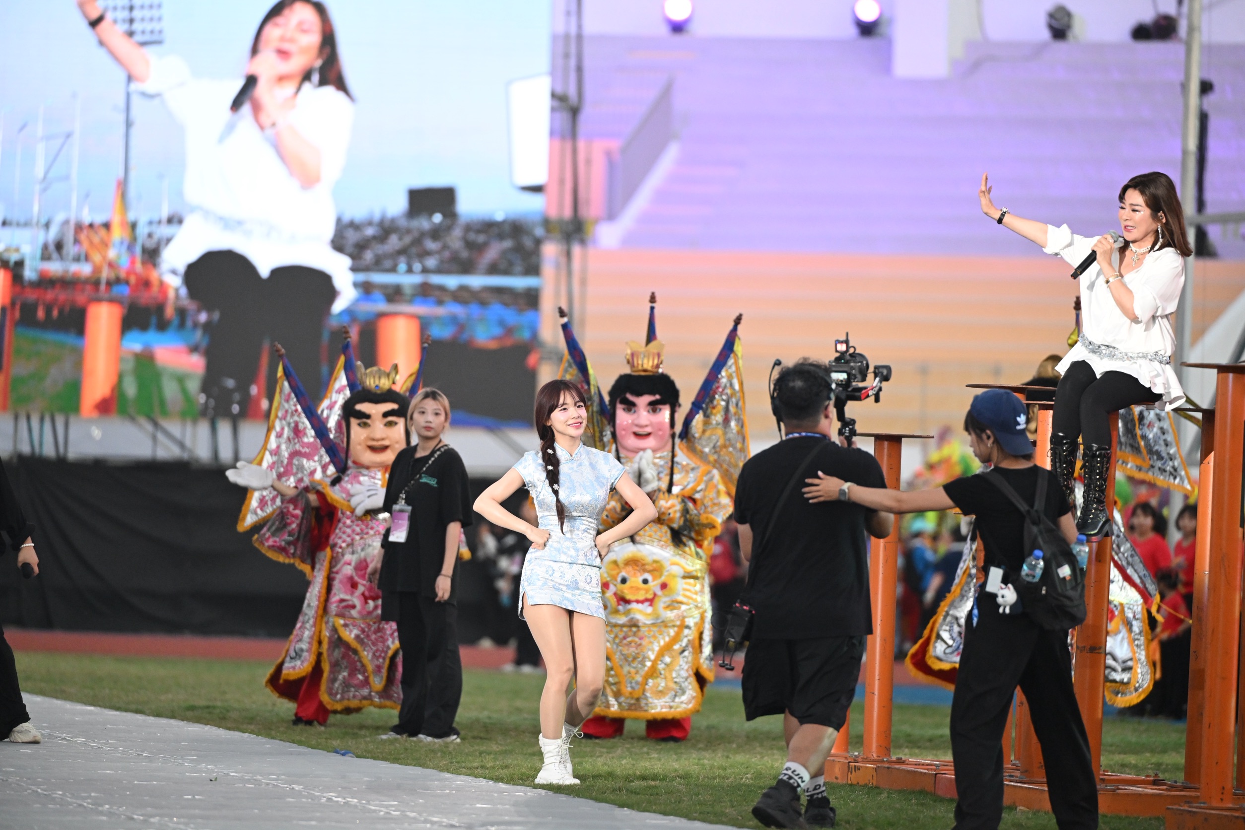 王彩樺(右上)、李多慧一起在序幕表演獻藝,身後是電音三太子。(114年全國運動會提供)