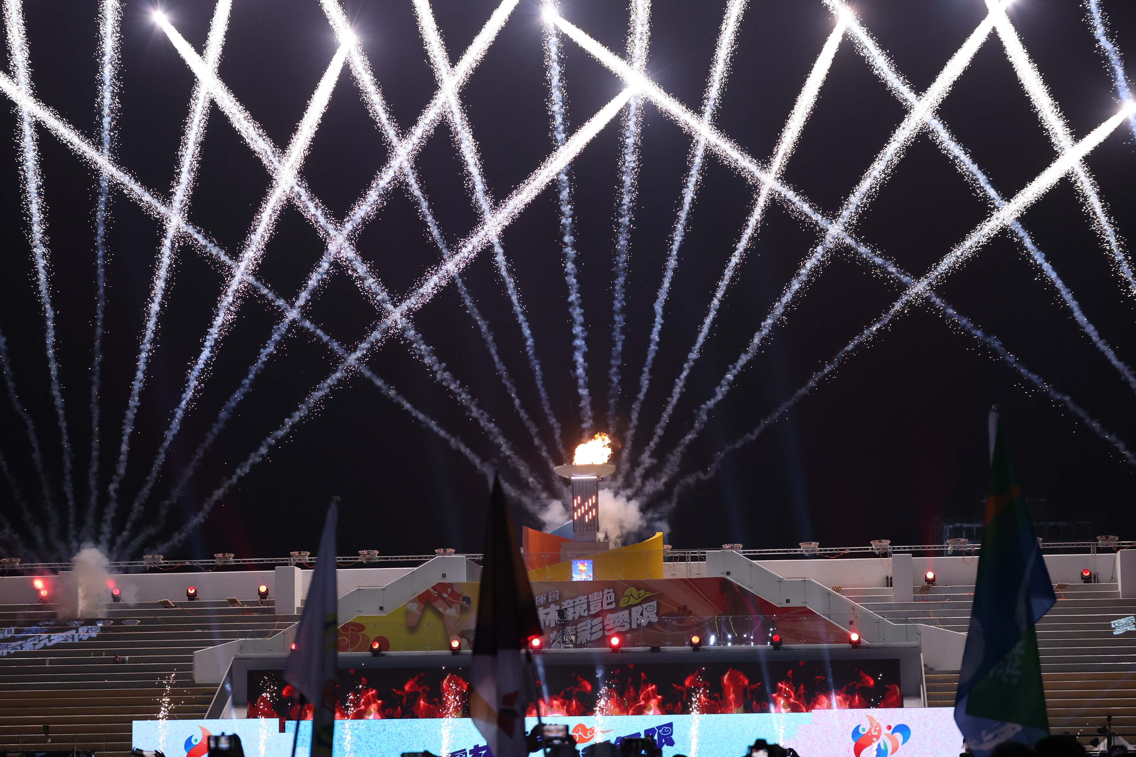 114年全國運動會聖火點燃後,現場施放煙火。(114年全國運動會提供)