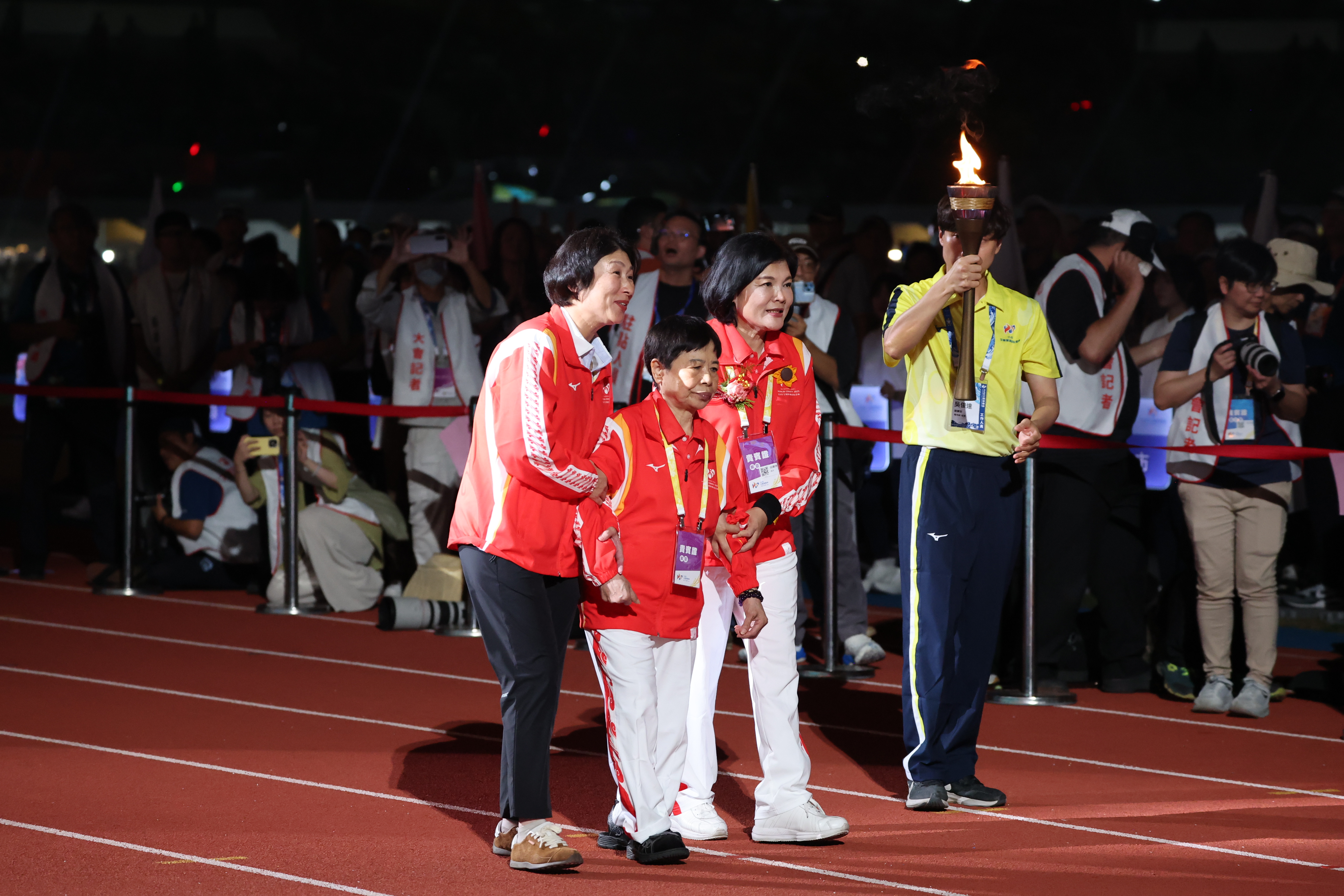 雲林縣長張麗善(右)、臺東縣長饒慶鈴(左)攙扶慈善家陳樹菊(中)攜聖火入場。(114年全國運動會提供)