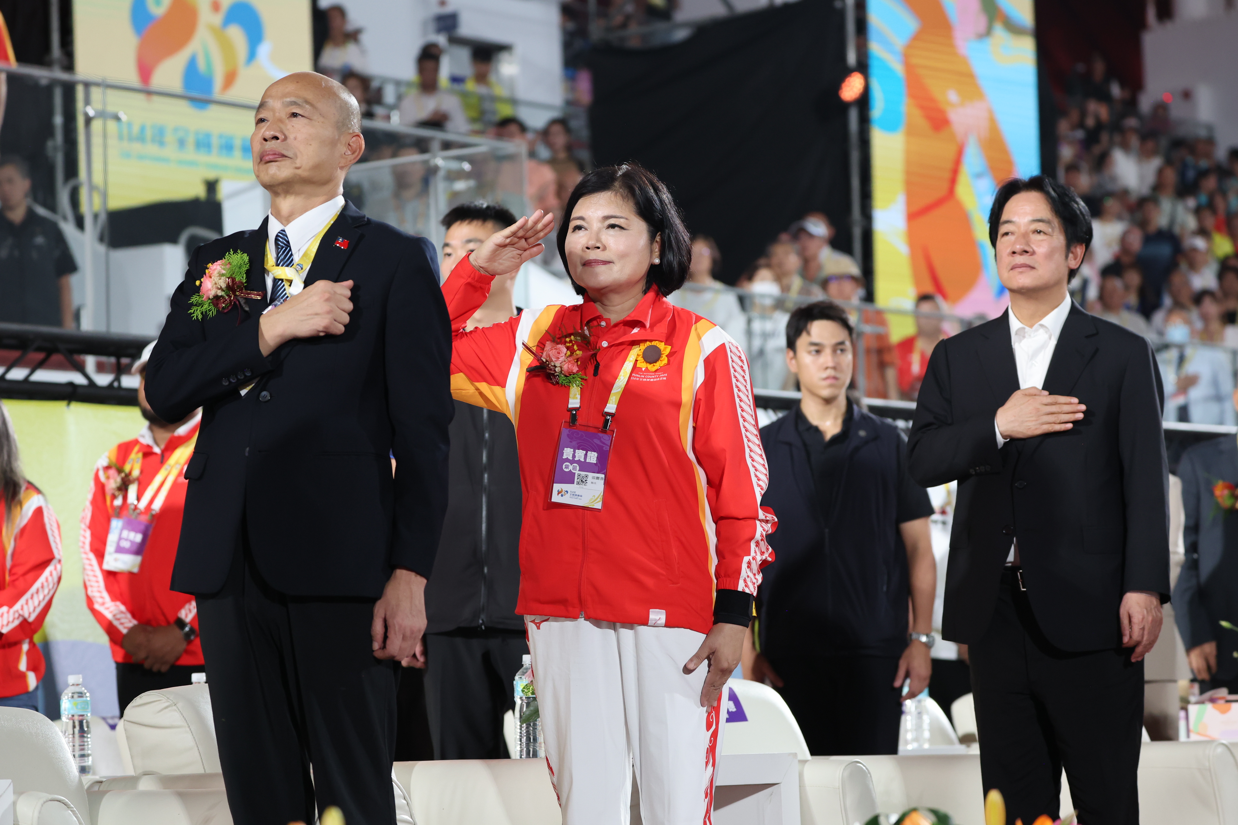 總統賴清德(右)、立法院院長韓國瑜(左)、雲林縣縣長張麗善(中)在114年全國運動會開幕典禮。(114年全國運動會提供)