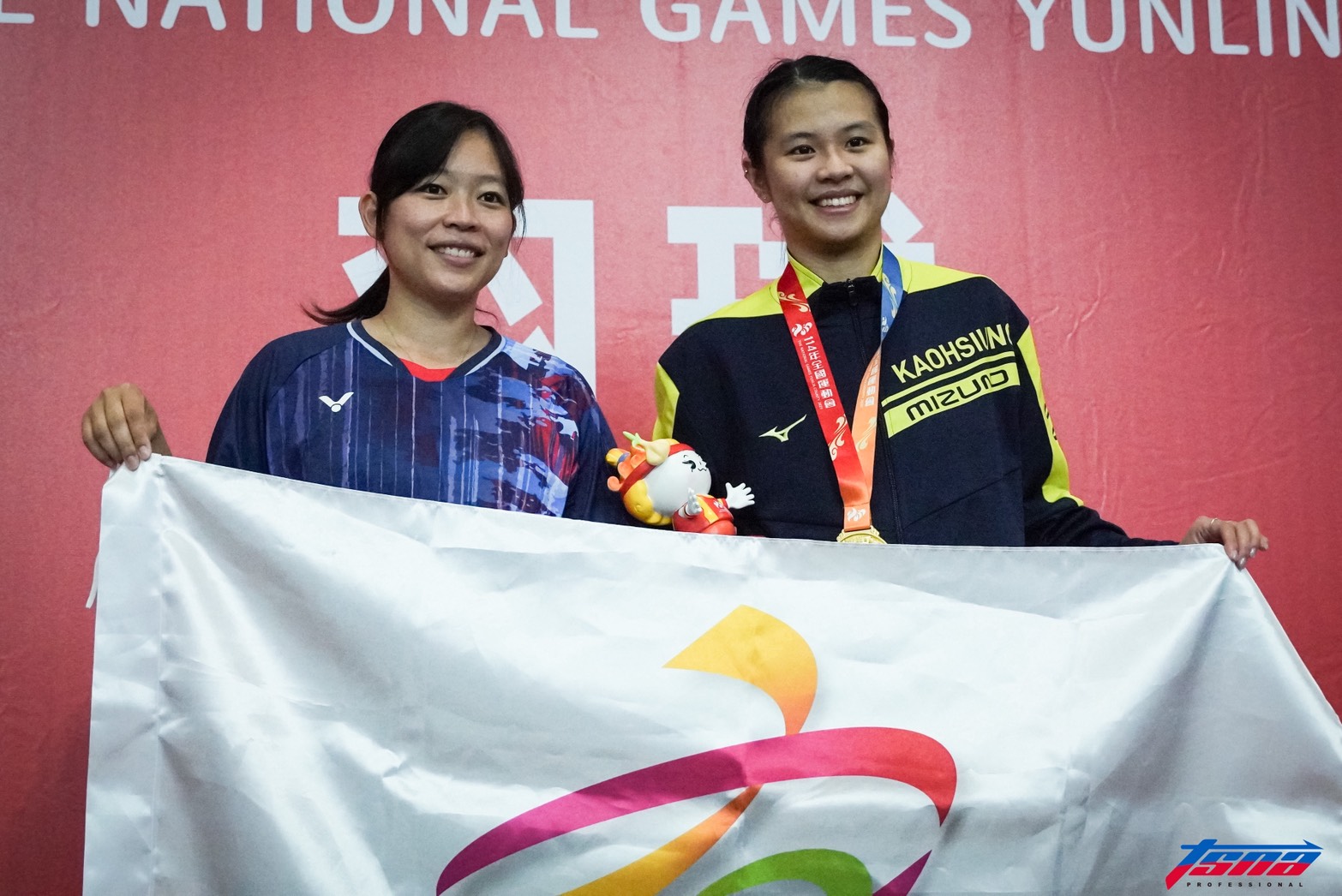 邱品蒨與高雄市教練、也是賽會前女單金牌的現任教練陳曉歡在頒獎台舉起市旗合照。(黃以信/攝)