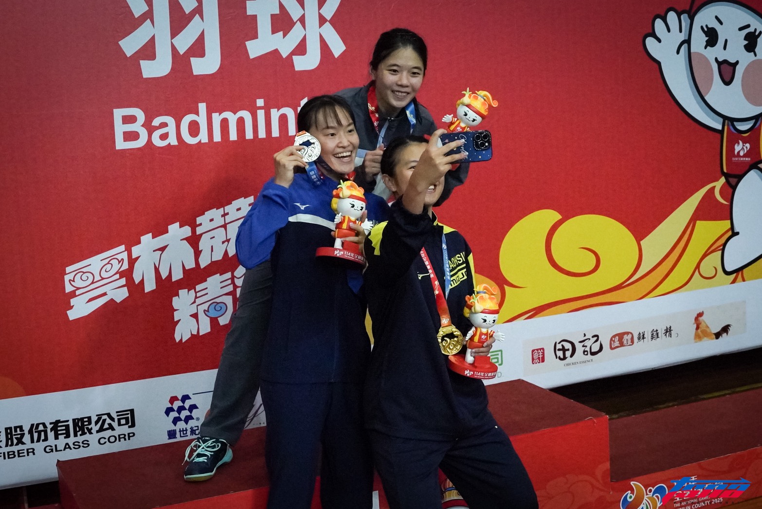 邱品蒨頒獎後邀請銀牌許玟琪、銅牌宋碩芸自拍。(黃以信/攝)