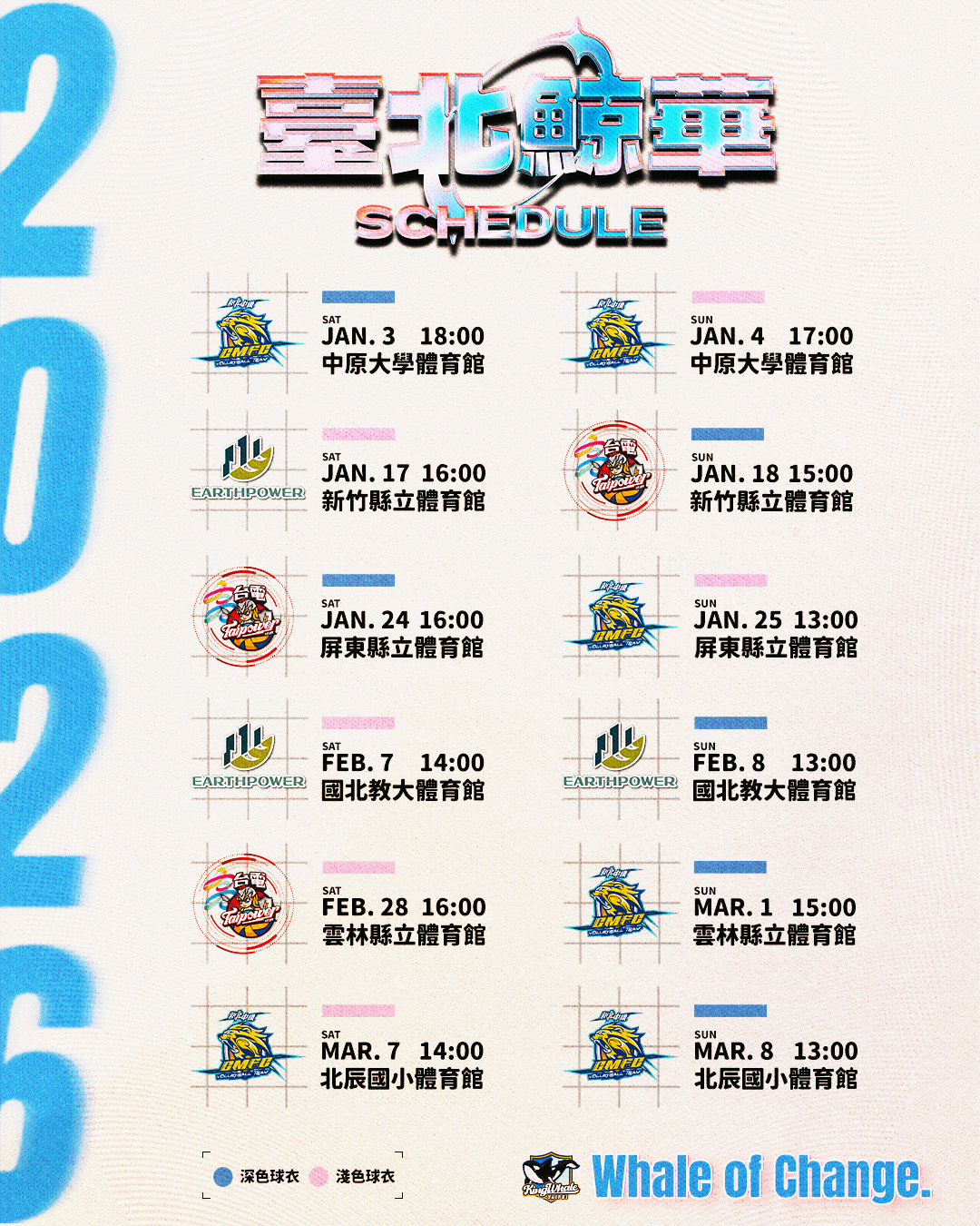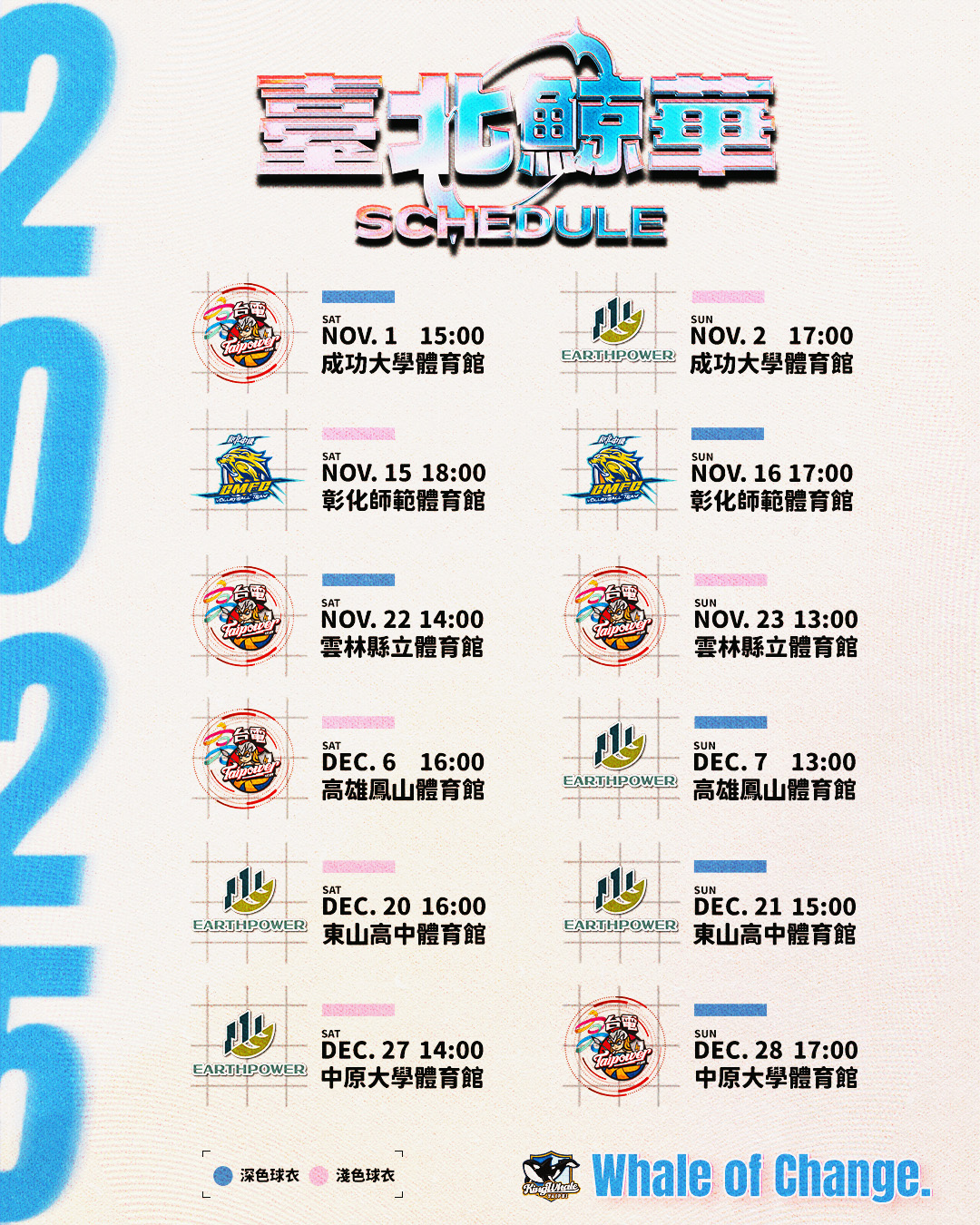 開幕首周臺北鯨華在成大體育館連2天出賽,11/1下午15時與高雄台電重演上季爭冠戲碼,11/2預定傍晚17時對義力營造。