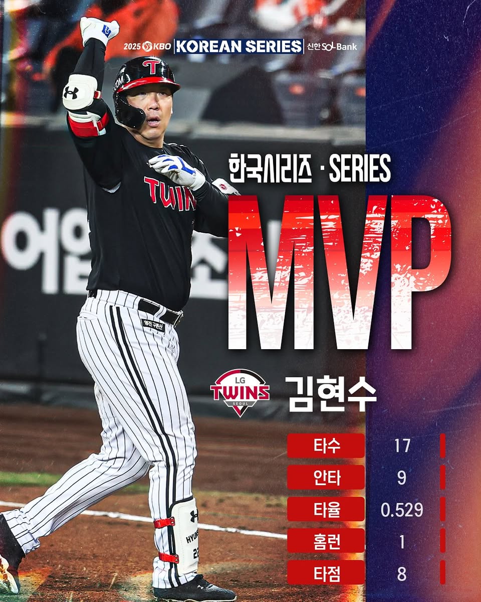 金賢洙在系列賽17打數9安打,打擊率高達5成29,1轟,還有8打點,拿到MVP實至名歸。LG在1990、1994以及2023年都曾奪冠過,這是隊史第四度奪冠。