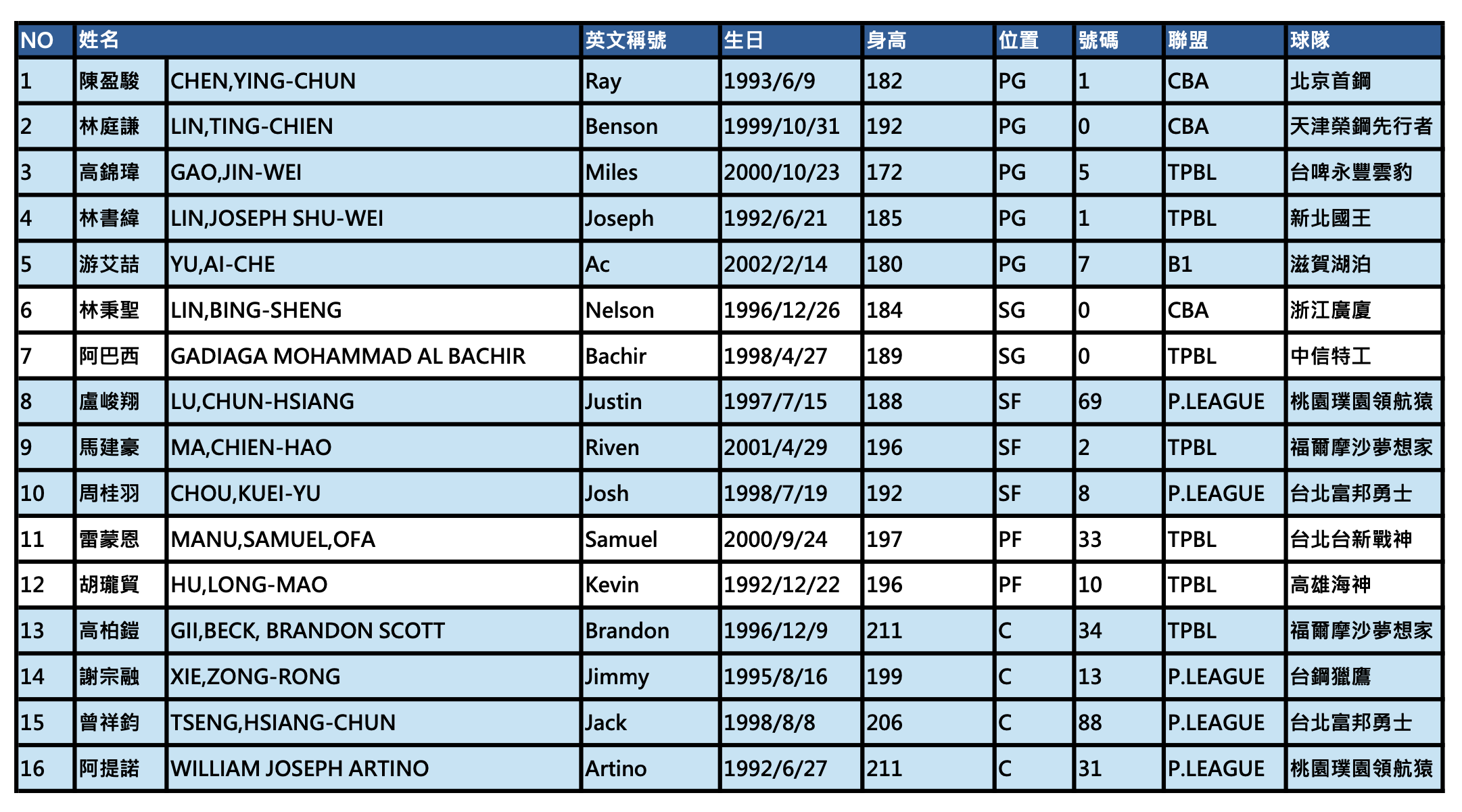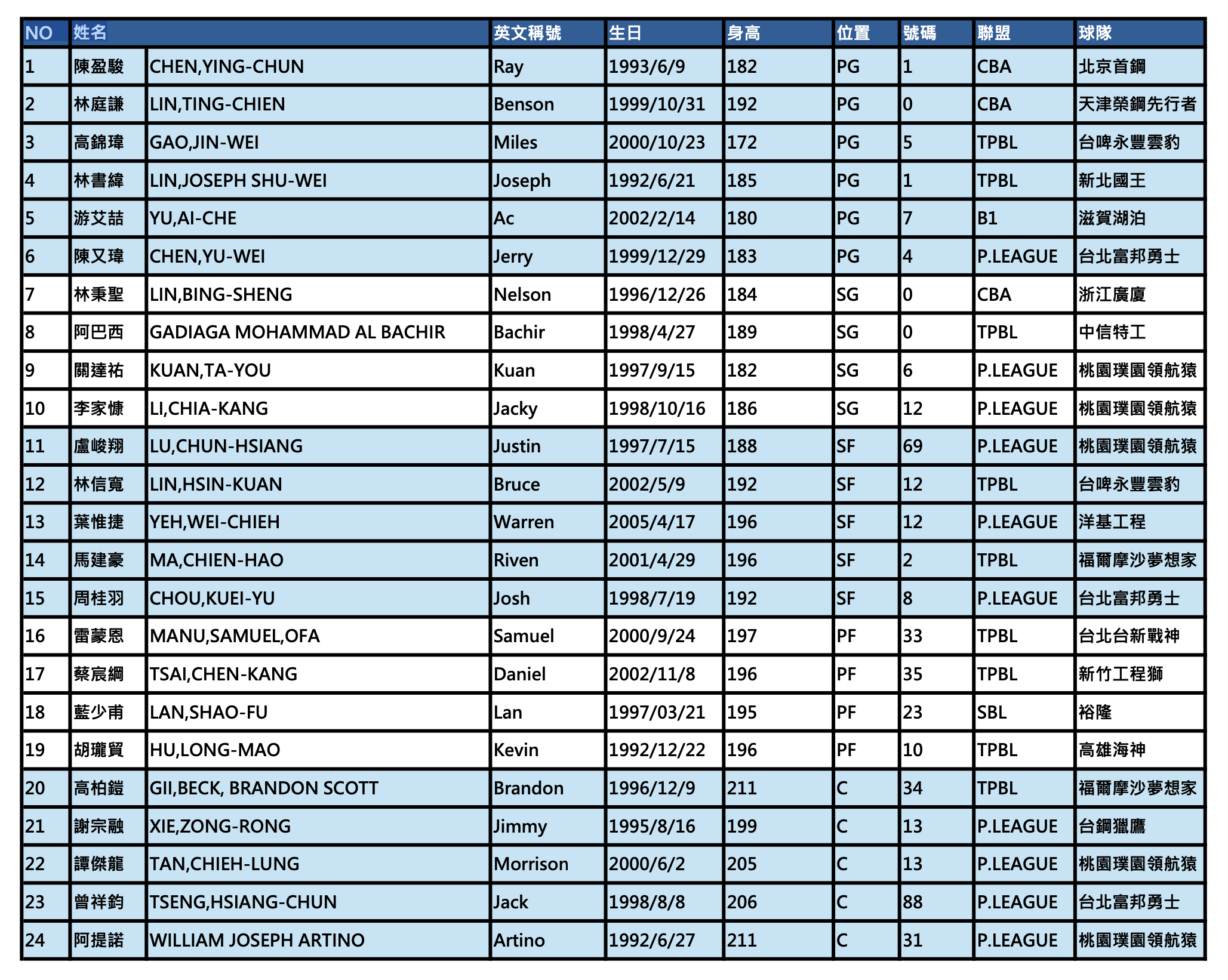 原16人名單如下,陳盈駿、林庭謙、高錦瑋、林書緯、游艾喆、林秉聖、阿巴西、盧峻翔、馬建豪、周桂羽、雷蒙恩、胡瓏貿、高柏鎧、謝宗融、曾祥鈞、 阿提諾。