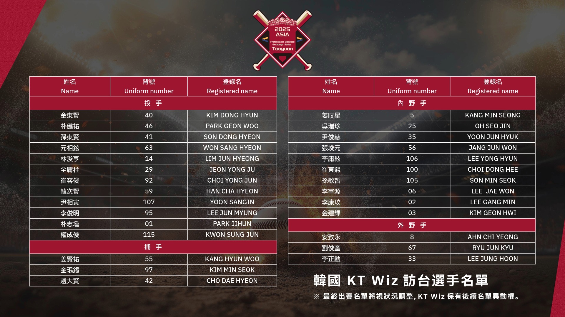 2025 桃園亞洲職棒交流賽本週末即將於樂天桃園棒球場開打,今公布韓國代表韓職KT巫師(KT Wiz)名單,由上屆世界棒球經典賽(