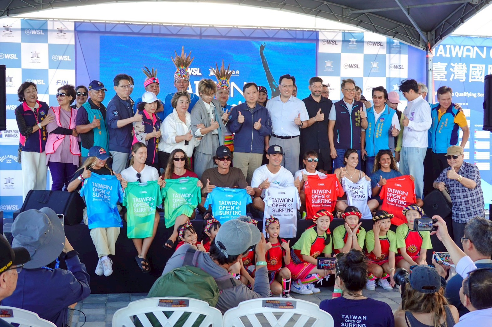 鄭世忠、臺東縣政府王志輝副縣長、世界衝浪聯盟(World Surf League, WSL)巡迴賽資深經理Mr. Will Hayden-Smith歡迎各國衝浪好手來臺參賽。