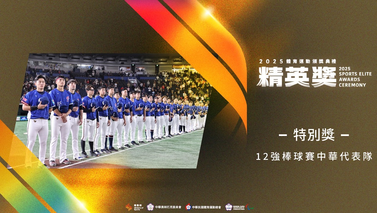 運動部今(6)日公布「2025年體育運動精英獎」各項入圍名單,同時揭曉「終身成就獎」與「特別獎」得主,分別由排球推手蔡崇濱先生,以及「12強棒球賽中華代表隊」獲得。而12強棒球賽中華代表隊並入圍最佳運動團隊獎,總教煉曾豪駒入圍最佳教練獎,陳傑憲入最佳男運動員獎,今年頒獎典禮將於12月24日舉行。