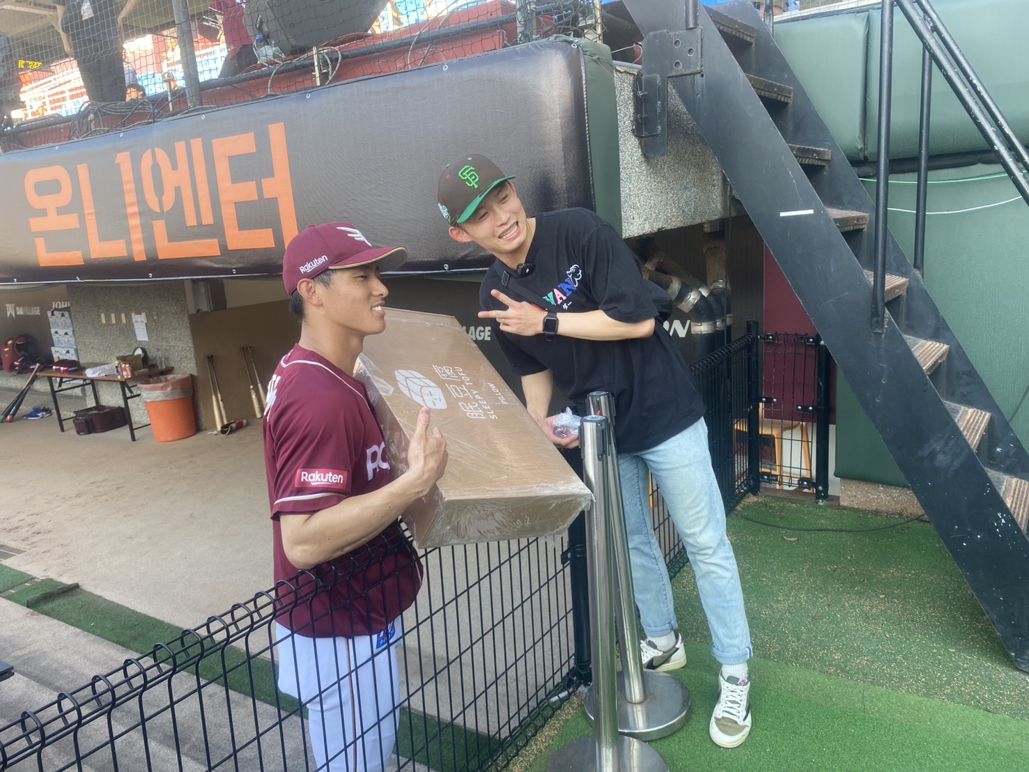 2025桃園亞洲職棒交流賽今天上演樂天桃猿跟樂天金鷲的「樂天內戰」,賽前樂天金鷲野手辰己涼介跟「網友」江國豪面交,不但送上台灣特產「大禮包」,兩人還開心合影。