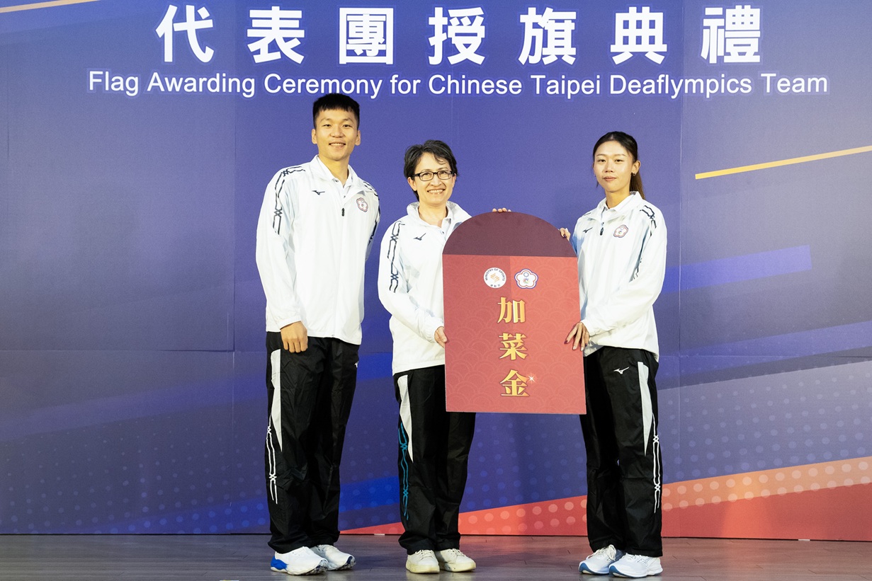 副總統蕭美琴在運動部部長李洋陪同下為代表團授旗,將國旗交給團長、中華民國聽障者體育運動協會理事長林昭穎,加菜金則由網球好手林家文代表接受。