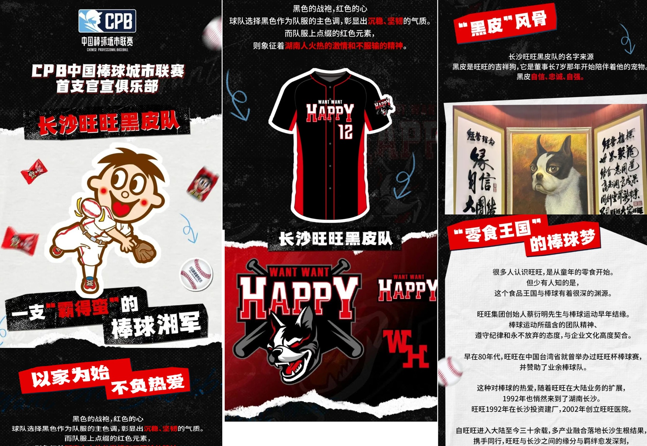 中國棒球城市聯賽(CPB)今日正式宣布首支球隊,由台灣旺旺集團所成立的「長沙旺旺黑皮隊」,官網指出,「黑皮」的隊伍名來自於集團創辦人蔡衍明7歲時所養的寵物。球隊以黑、紅色作為主色系,並結合吃苦耐勞、不怕死的「湘軍精神」,官網寫下,「旺旺誕生於台灣,生長於中國大陸,長沙是旺旺在大陸的家鄉與主場,希望藉由旺旺為兩岸棒球運動員搭起一座交流橋樑。」