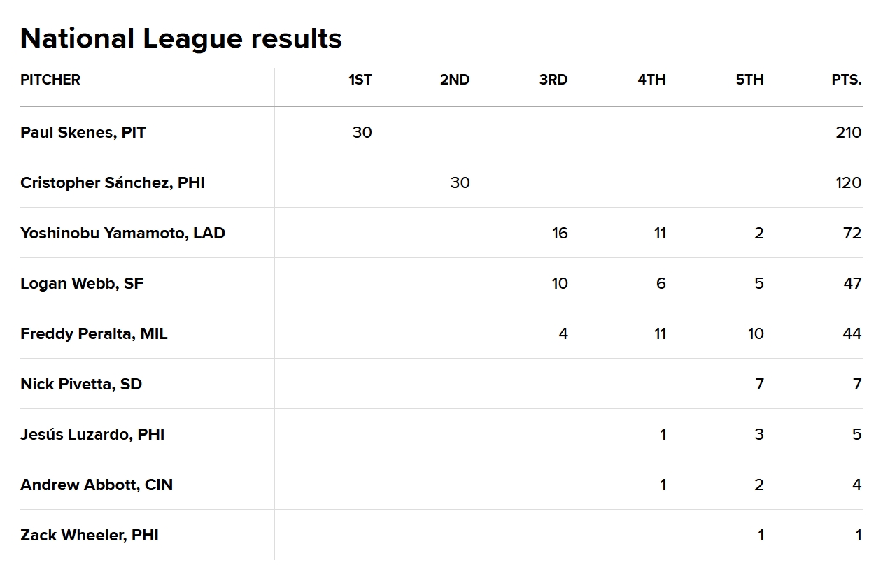 國聯賽揚獎由匹茲堡海盜Paul Skenes以全票拿下,戰績10勝10敗,但防禦率1.97為全聯盟最佳,還以216次三振並列聯盟第二,三振率達10.36。在評估選手整體貢獻度的指標「WARe」上,更拿下高達8.0的成績。