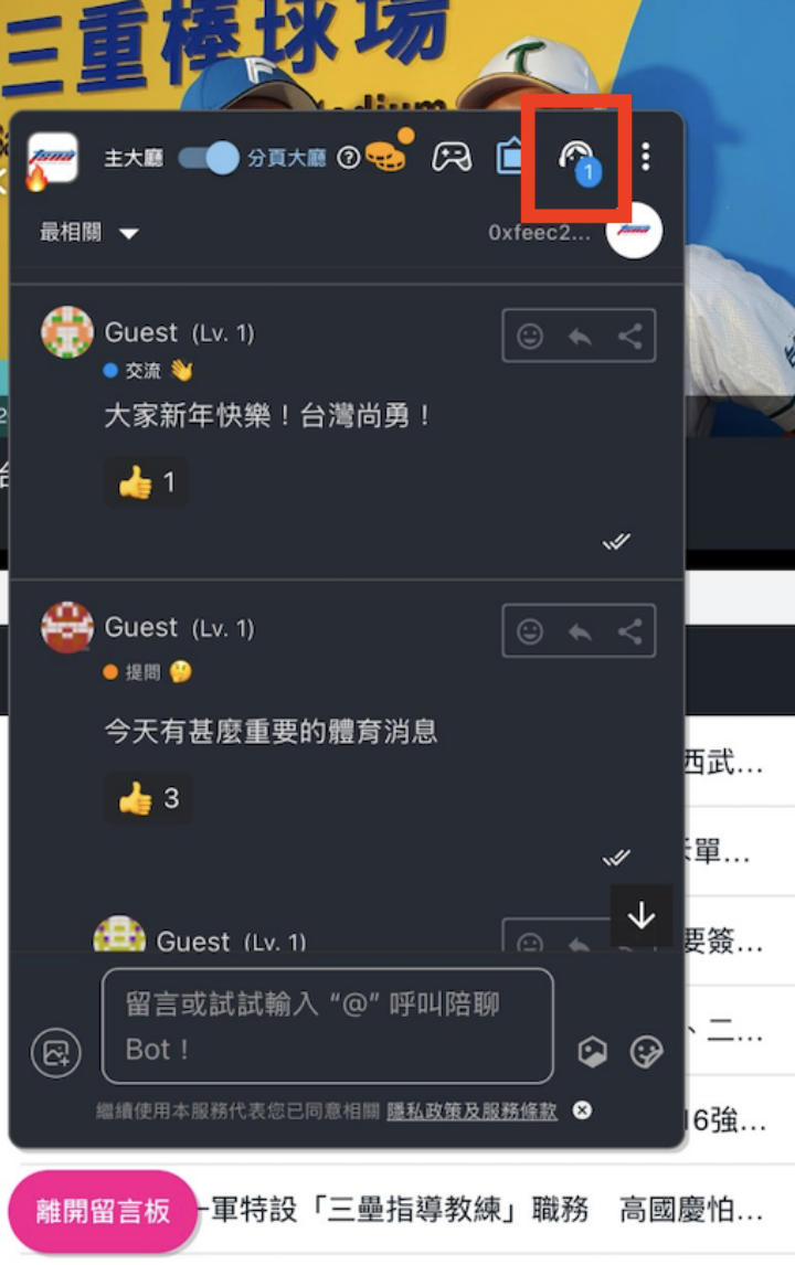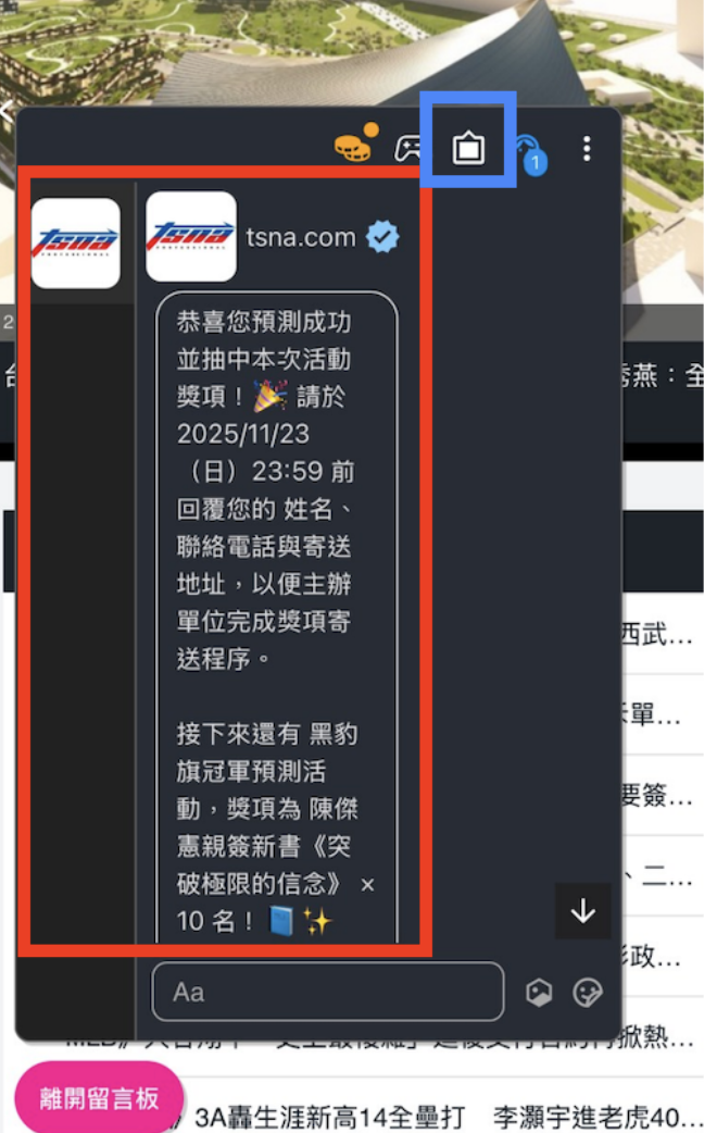 進入即可看到是否有中獎,若要返回留言板,請點選白板圖示(右3)
