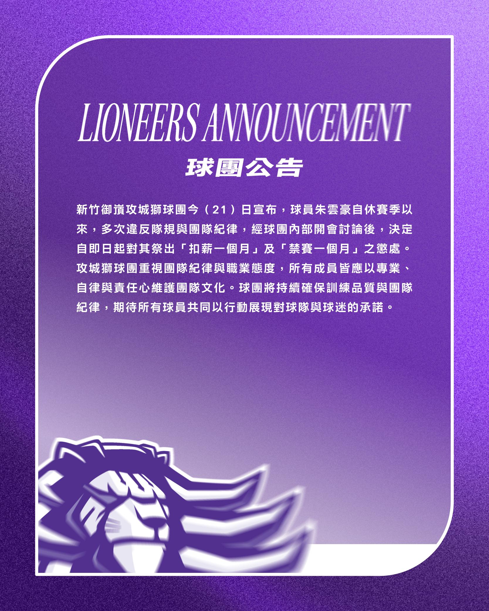 新竹御嵿攻城獅球團今日宣布,球員朱雲豪自休賽季以來,多次違反隊規與團隊紀律,經球團內部開會討論後,決定自即日起對其祭出「扣薪一個月」及「禁賽一個月」之懲處。攻城獅球團重視團隊紀律與職業態度,所有成員皆應以專業、自律與責任心維護團隊文化。球團將持續確保訓練品質與團隊紀律,期待所有球員共同以行動展現對球隊與球迷的承諾。