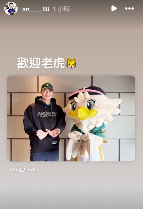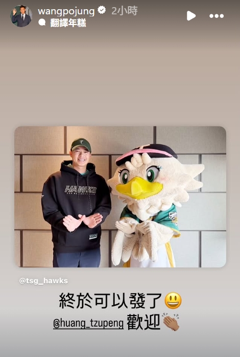 昔日桃猿隊友王柏融在IG限動上寫著:「終於可以發了,@huang_tzupeng歡迎。」藍寅倫發文「歡迎老虎!!」還附上老虎圖案。