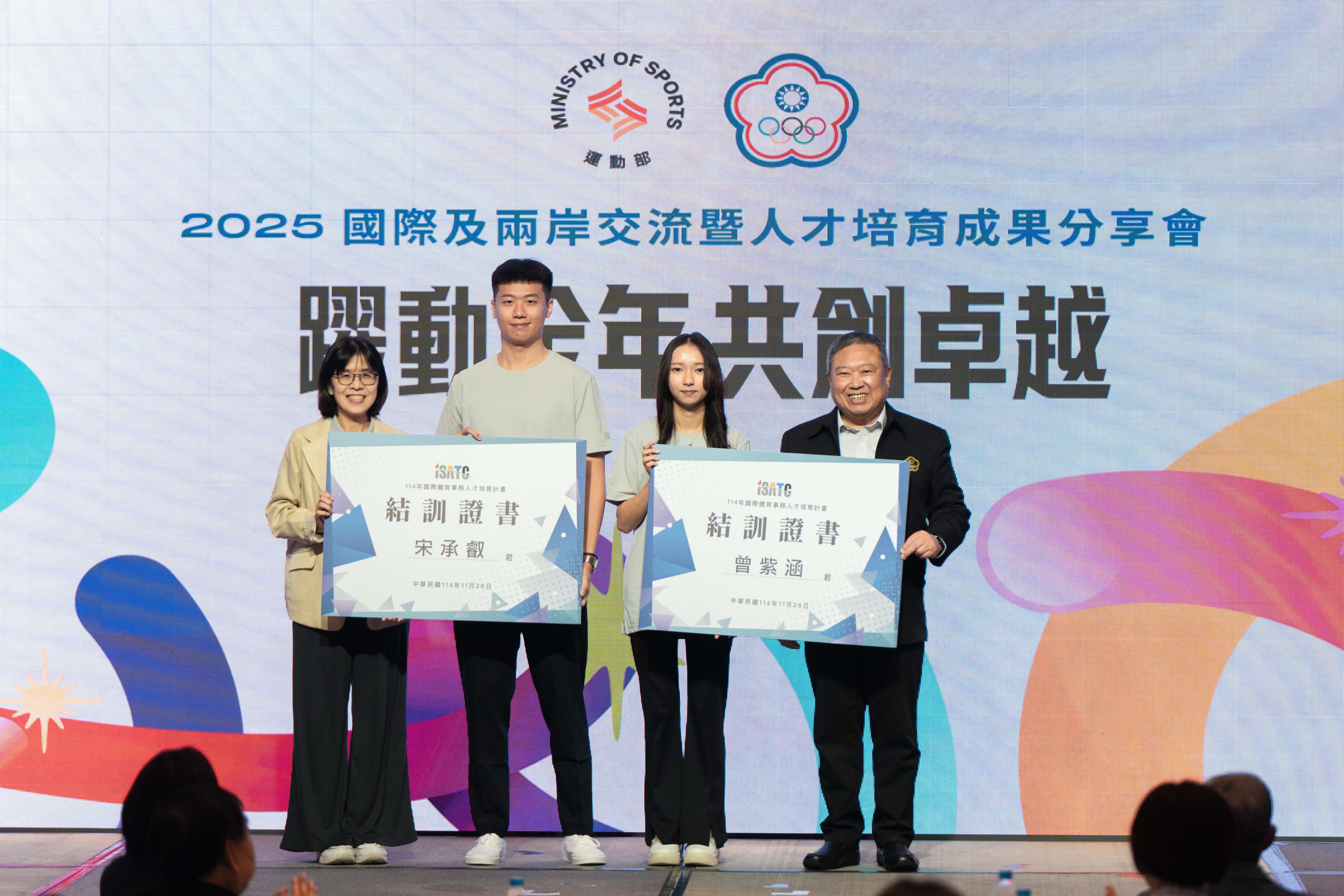 林鴻道(右1)、運動部國際事務司副司長許秀玲頒發結訓證書給國際體育事務人才培訓計畫學員。(中華奧林匹克委員會提供)