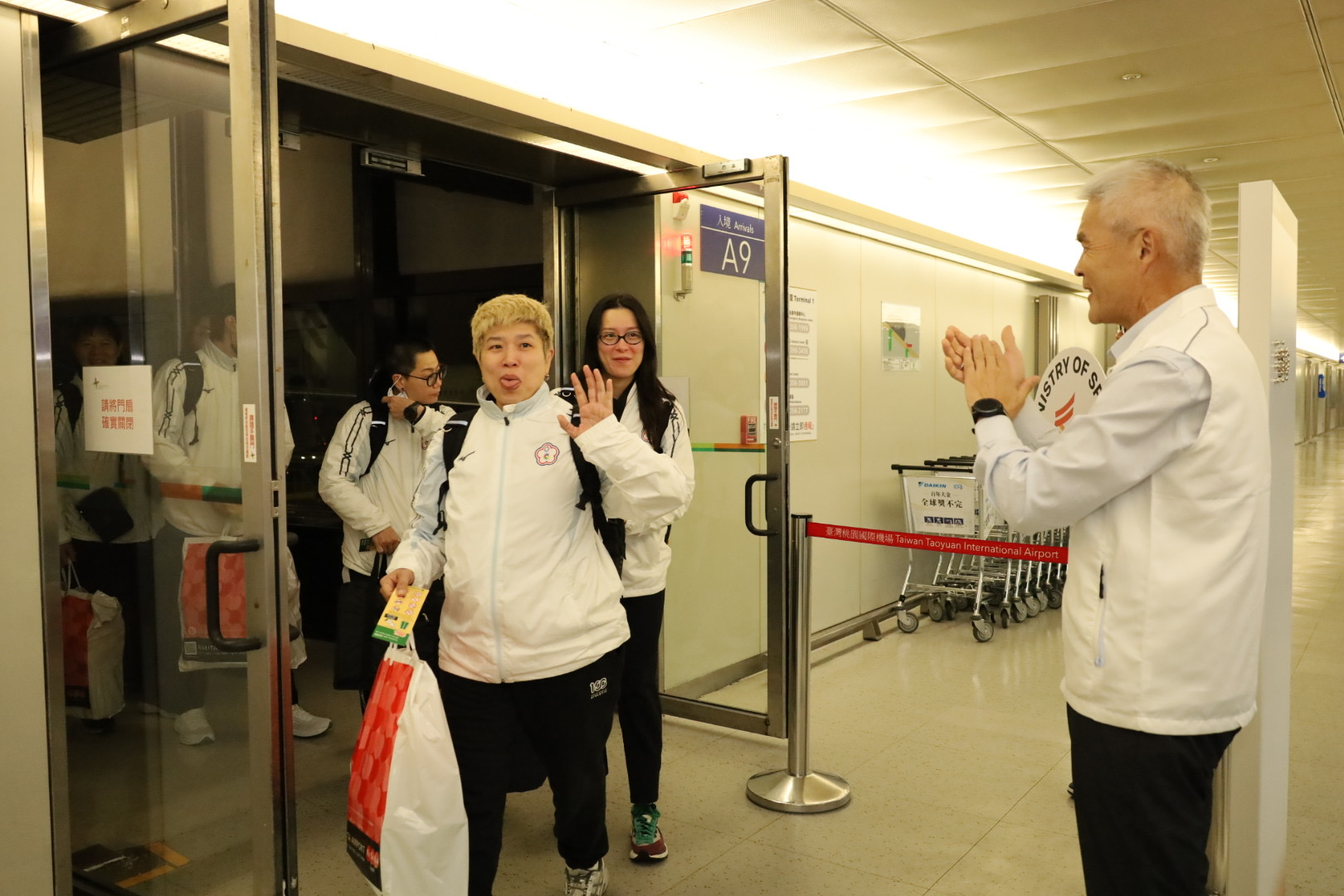 閉幕典禮同時,我國代表團最後一批選手教練們,順利返抵桃園機場。運動部黃啟煌政務次長及適應運動司林佩君司長,分別於第2航廈及第1航廈迎接代表團,歡迎選手教練回家,並親自慰勉選手們的卓越表現及後勤支援團隊的辛勤付出。