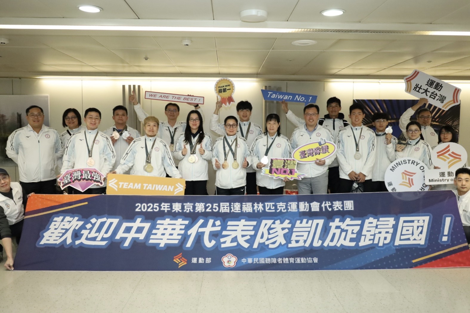 2025年東京第25屆達福林匹克運動會(簡稱聽奧)在今(26)日舉辦閉幕典禮,我國由曾於2001、2005及2009年分別拿下聽奧田徑十項全能金、銀、銅牌的安慶隆教練代表掌旗進場,宣示代表團參賽任務圓滿達成。我國代表團本屆參賽收穫1金6銀6銅,共計13面獎牌,雖未突破近屆佳績,仍有獎牌榜第23名、總獎牌數第14名的表現,且本屆教練、中生代及新生代選手攜手砥礪,展現卓越實力與拚搏精神,透過優異的競技表現,將臺灣送上國際舞臺,落實以運動壯大臺灣的政策願景。