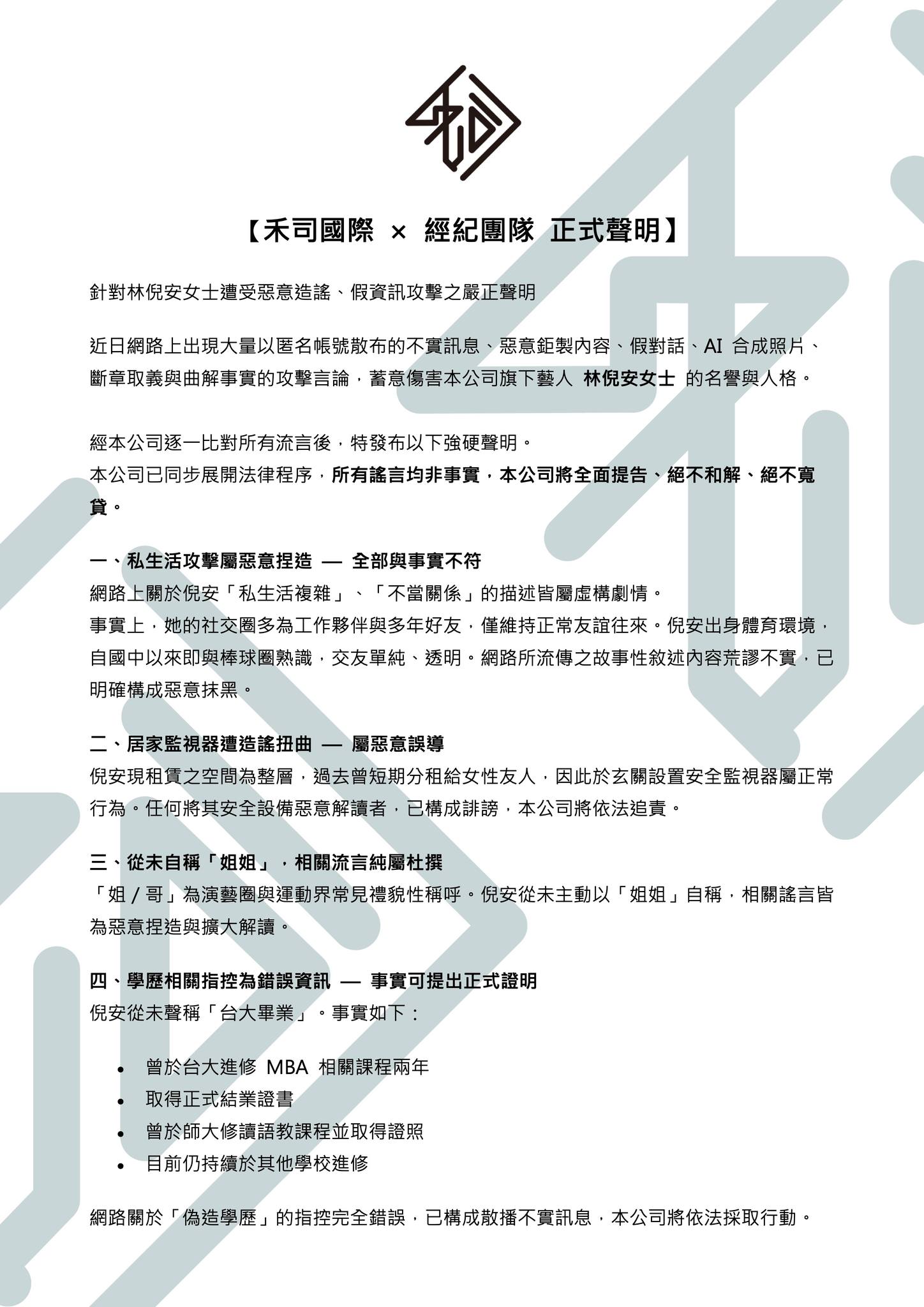 針對林倪安女士遭受惡意造謠、假資訊攻擊之嚴正聲明近日網路上出現大量以匿名帳號散布的不實訊息、惡意鉅製內容、假對話、AI 合成照片、斷章取義與曲解事實的攻擊言論,蓄意傷害本公司旗下藝人林倪安女士的名譽與人格。