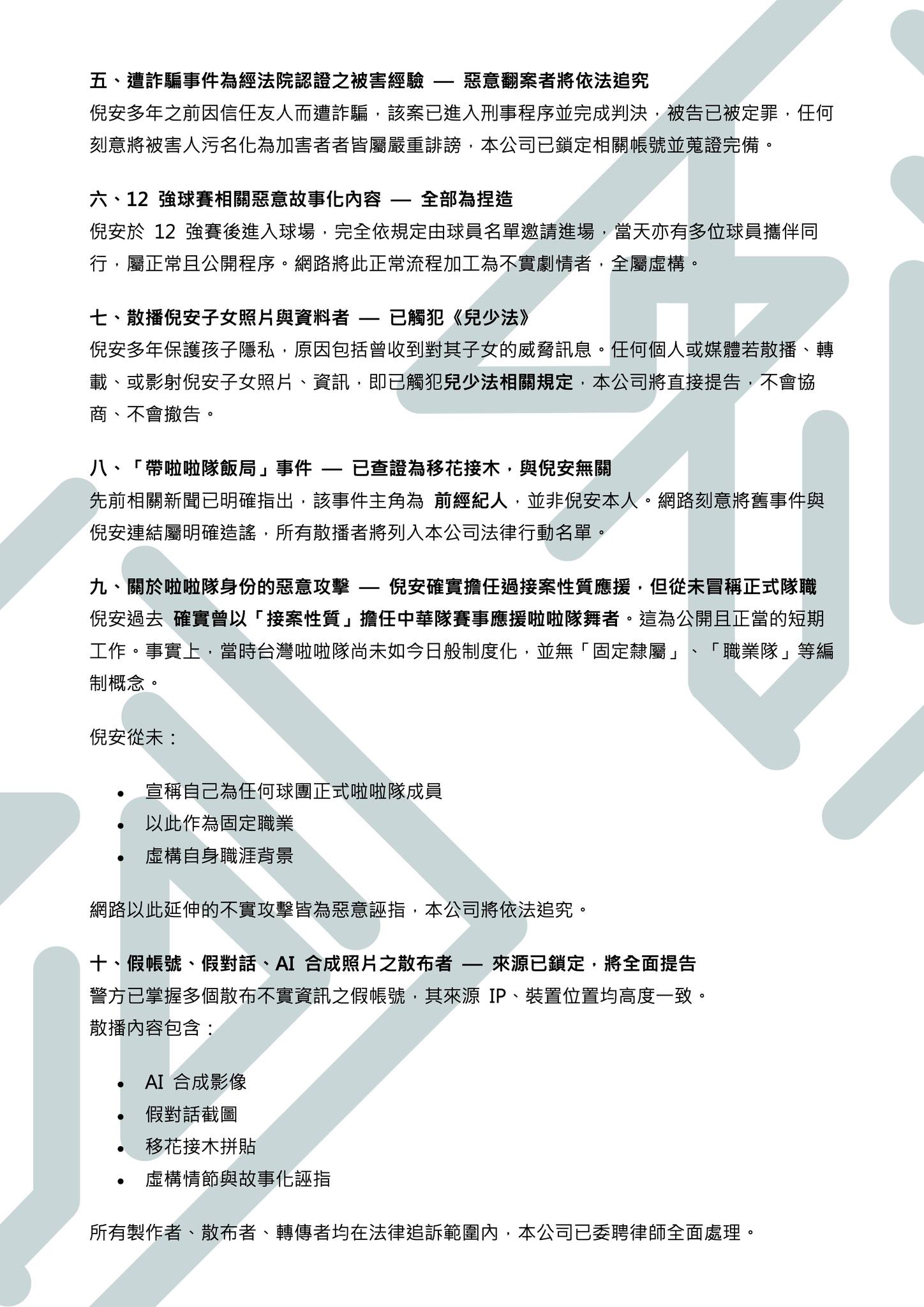 倪安多年之前因信任友人而遭詐騙,該案已進入刑事程序並完成判決,被告已被定罪,任何刻意將被害人污名化為加害者者皆屬嚴重誹謗,本公司已鎖定相關帳號並蒐證完備。