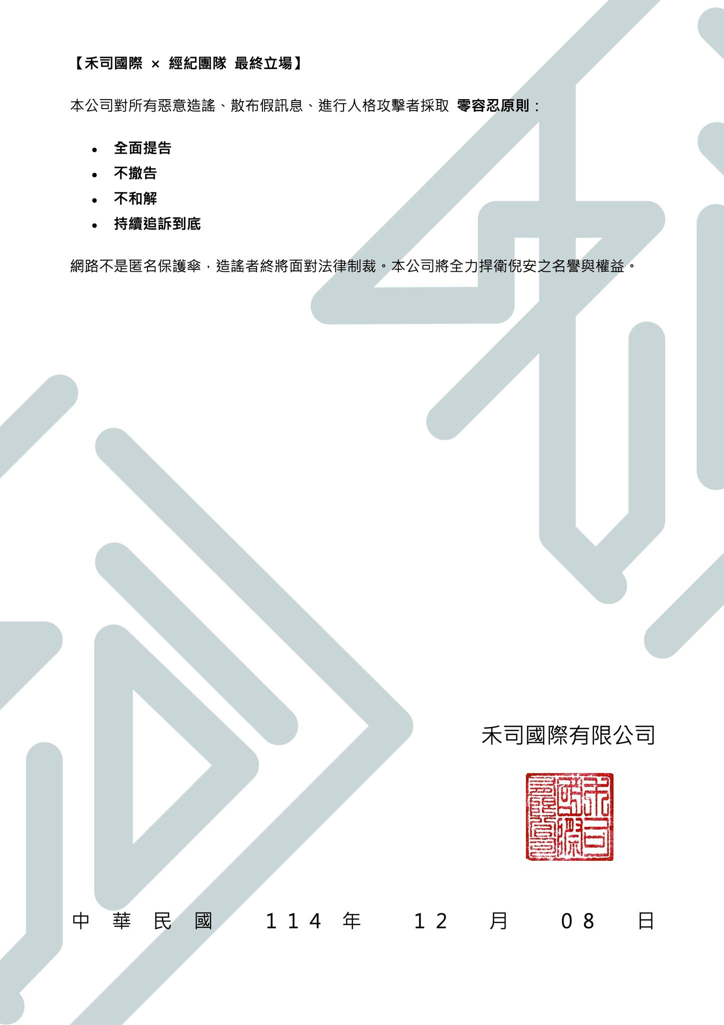 網路不是匿名保護傘,造謠者終將面對法律制裁。本公司將全力捍衛倪安之名譽與權益。