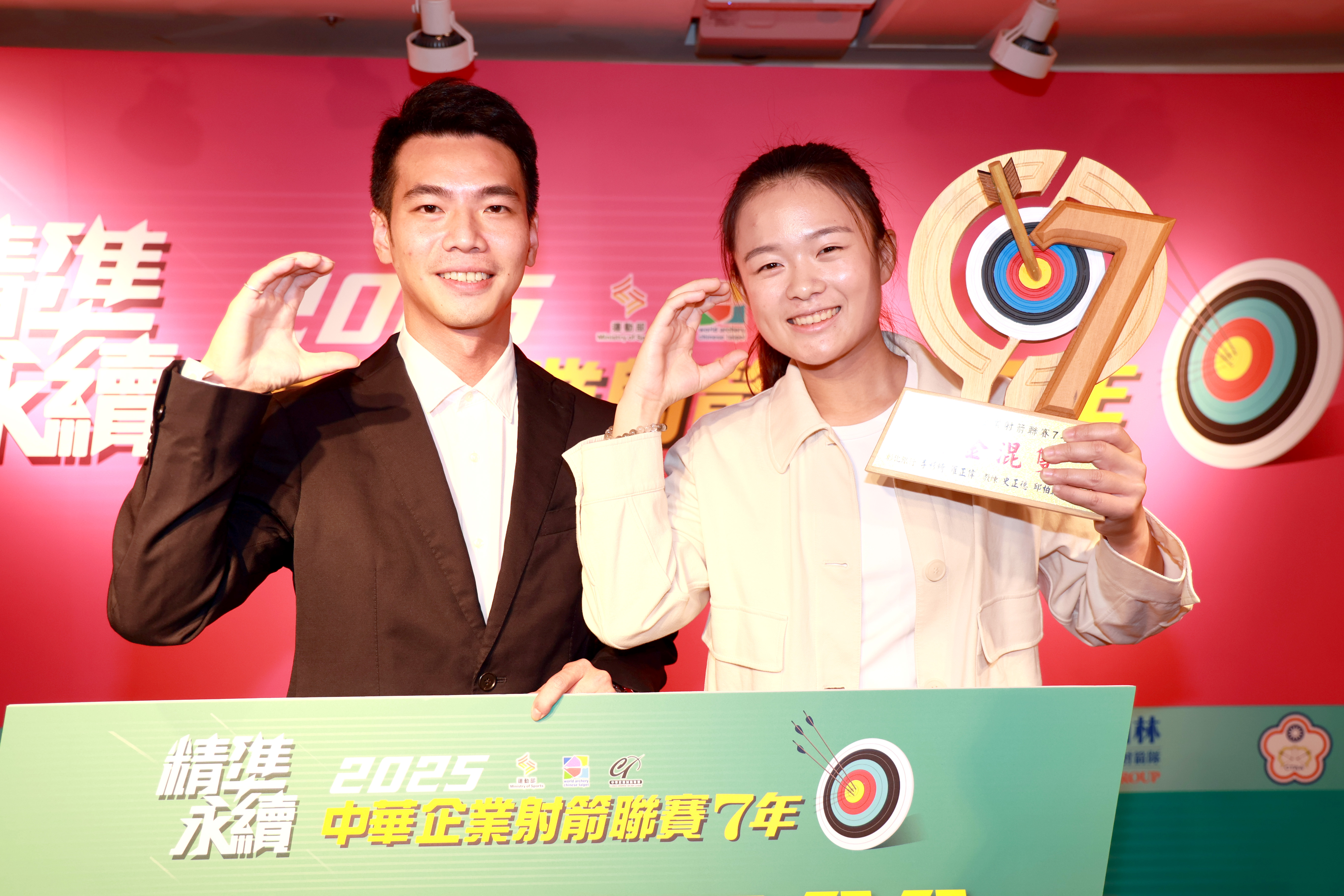蔡明修、風佑築分別獲得十分箭王、箭后。(中華民國射箭協會提供)