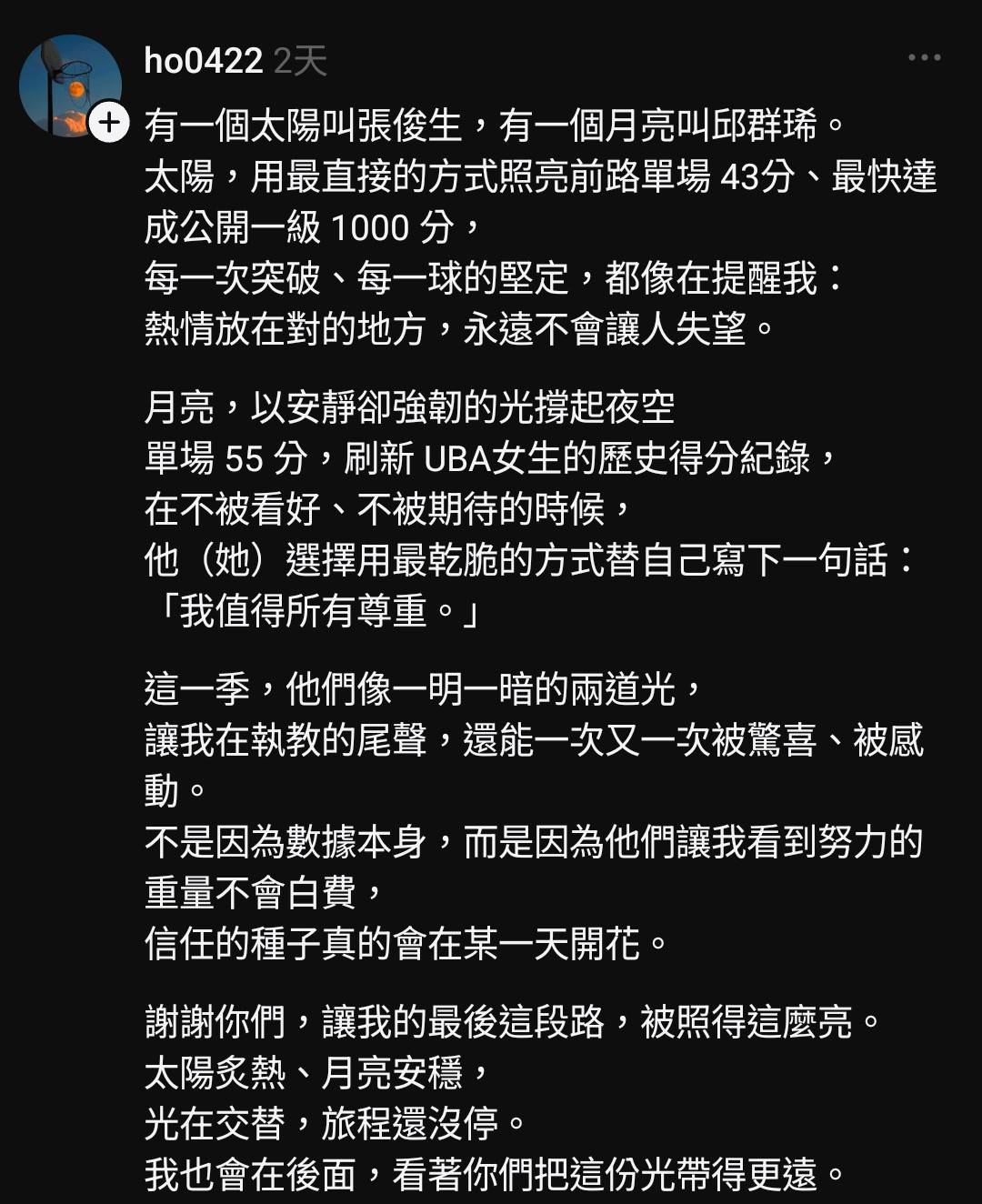 114學年度UBA公開一級戰場新紀錄頻傳,中信學院成為話題焦點。男隊張俊生以3屆、53場比賽累積1001分,成為UBA「千分最速男」;女隊邱群琋則單場狂轟72分,刷新公開一級(不分男女)單場最高得分紀錄。中信學院總教練何正峰日前在社群以「太陽」與「月亮」形容兩人,如今也首度談起這段形容背後,其實藏著一段艱辛卻溫暖的故事。