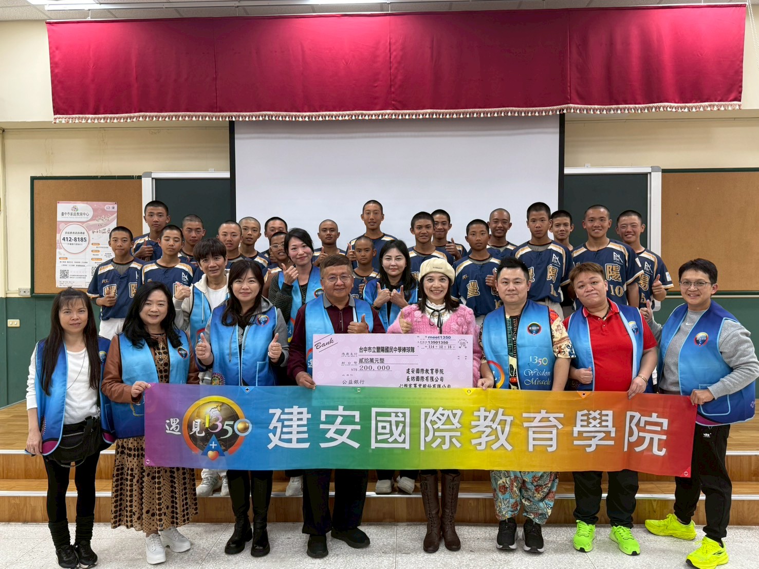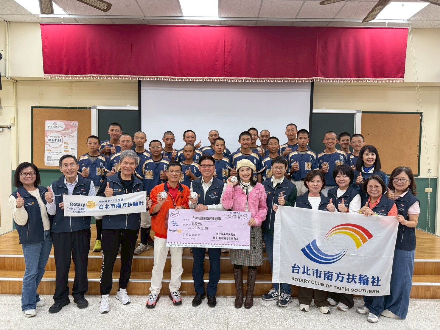 為強化基層體育量能、厚植校園運動根基,豐陽國中棒球隊12月15日下午14時於校內視聽教室及運動場,舉辦「豐陽棒球隊聯合捐贈與體驗交流活動」。活動中,社團法人臺北市南方扶輪社捐贈新臺幣10萬元,建安國際教育學院、長坊國際有限公司、心想家事業股份有限公司亦共同捐贈新臺幣20萬元,合計30萬元,以實際行動支持基層棒球訓練與學生多元發展,展現企業與社團攜手教育的正向力量。