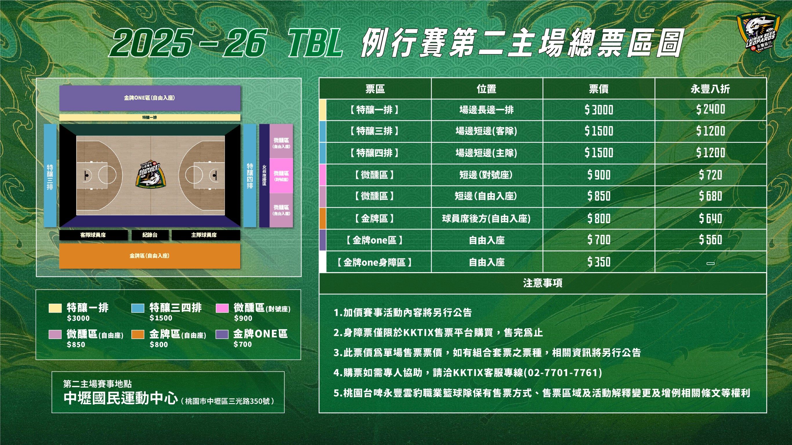 因應場館座位配置,對號座票種包括特釀一排3,000元、特釀三、四排1,500元、微醺對號區900元;自由入座票種則有微醺區850元、金牌區800元、金牌ONE區700元,整體視角更貼近球場,讓豹迷能以親民票價進場感受主場氛圍。