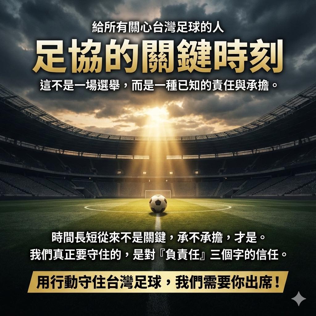 張璨今天在臉書發文「給所有關心台灣足球的人」,他表示,再過兩天,足協將迎來一個重要的時刻。「這不是一場選舉,而是一種已知的責任與承擔;時間長短從來不是關鍵,承不承擔,才是。我們真正要守住的,是對『負責任』三個字的信任」,呼籲「用行動守住台灣足球,我們需要你出席」。